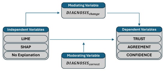 Variables of the study were selected in such a way to explore the impact of different XAI methods on medical experts’ diagnostic decision-making. The independent variables are groups (i.e., LIME group, SHAP group, and No XAI group), which we aim to compare with each other. The dependent variables (i.e., trust, agreement, and confidence) are meant to assess the impact of the XAI methods on the participants perception of various aspects of XAI. The moderating variable (i.e., ) is included to investigate how the correctness of the initial diagnosis is affected by the independent variables and what the influence is of this effect on the dependent variables. Finally, the mediating variable (i.e., ) is used to explore potential mechanisms, through which the independent variables influence the dependent variables. Figure 3 is an overview of the user study variables representing the relationships among the independent, mediating, moderating, and dependent variables. Therefore, the presence of an explanation may lead to a change in diagnosis, which affects the participants’ trust, agreement, and confidence. Moreover, the correctness of the initial diagnosis can influence the extent to which the explanations affect trust, agreement, and confidence.