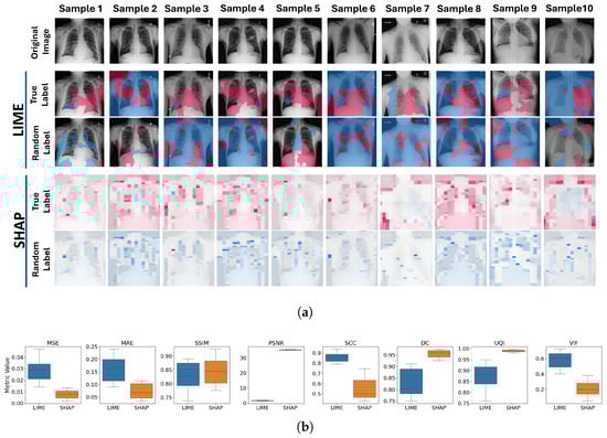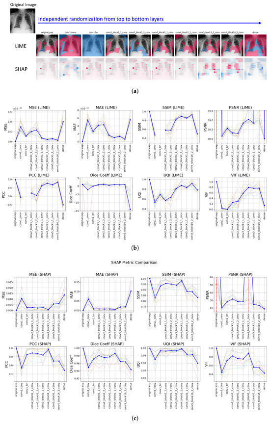 To evaluate differences between the original predictive model and the model with a selected randomized layer, we select different image quality metrics such as basic error metrics (i.e., MSE and MAE), perceptual quality metrics (i.e., SSIM, UQI, and VIF), and statistical metrics (i.e., PSNR, PCC, and Dice Coefficient). Each metric is chosen to provide a multifaceted understanding of the explanations generated by the XAI model. All of these image quality metrics are examined and applied in medical image processing studies such as [58,59].