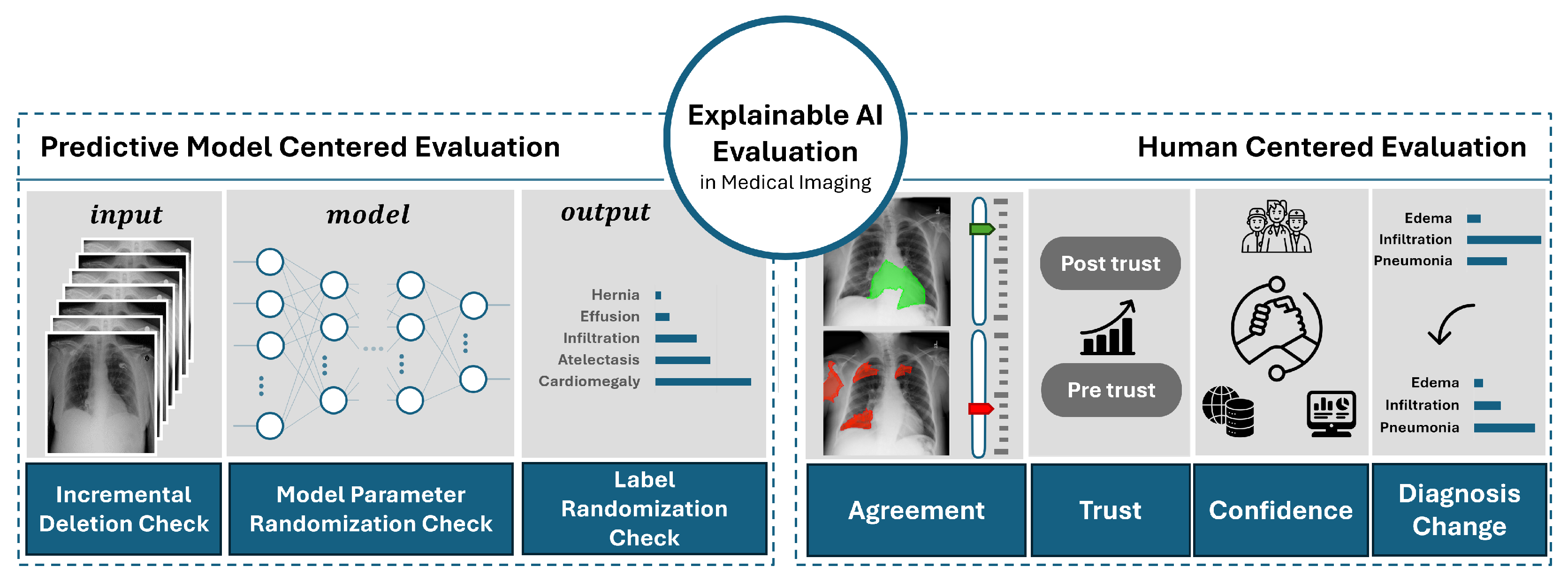 Our proposed evaluation framework, XIMED, directly addresses this gap by comprehensively integrating both predictive model-centered and human-centered evaluation within a single unified design. The novelty of XIMED lies not only in combining these perspectives but in establishing a standardized and reproducible framework that implements their integration. Specifically, it incorporates essential predictive model-centered criteria (input–output relationships and model structure–based evaluation), which constitute the minimum yet complete foundation required to assess explanations against the predictive model. These components ensure that all three elements of the model— input, structure, and output—are systematically examined through representative tests. In parallel, XIMED integrates human-centered criteria (trust calibration and agreement alignment) that capture how clinicians perceive and align with AI explanations by combining self-reported indicators of trust with performance-based measures of diagnostic alignment.