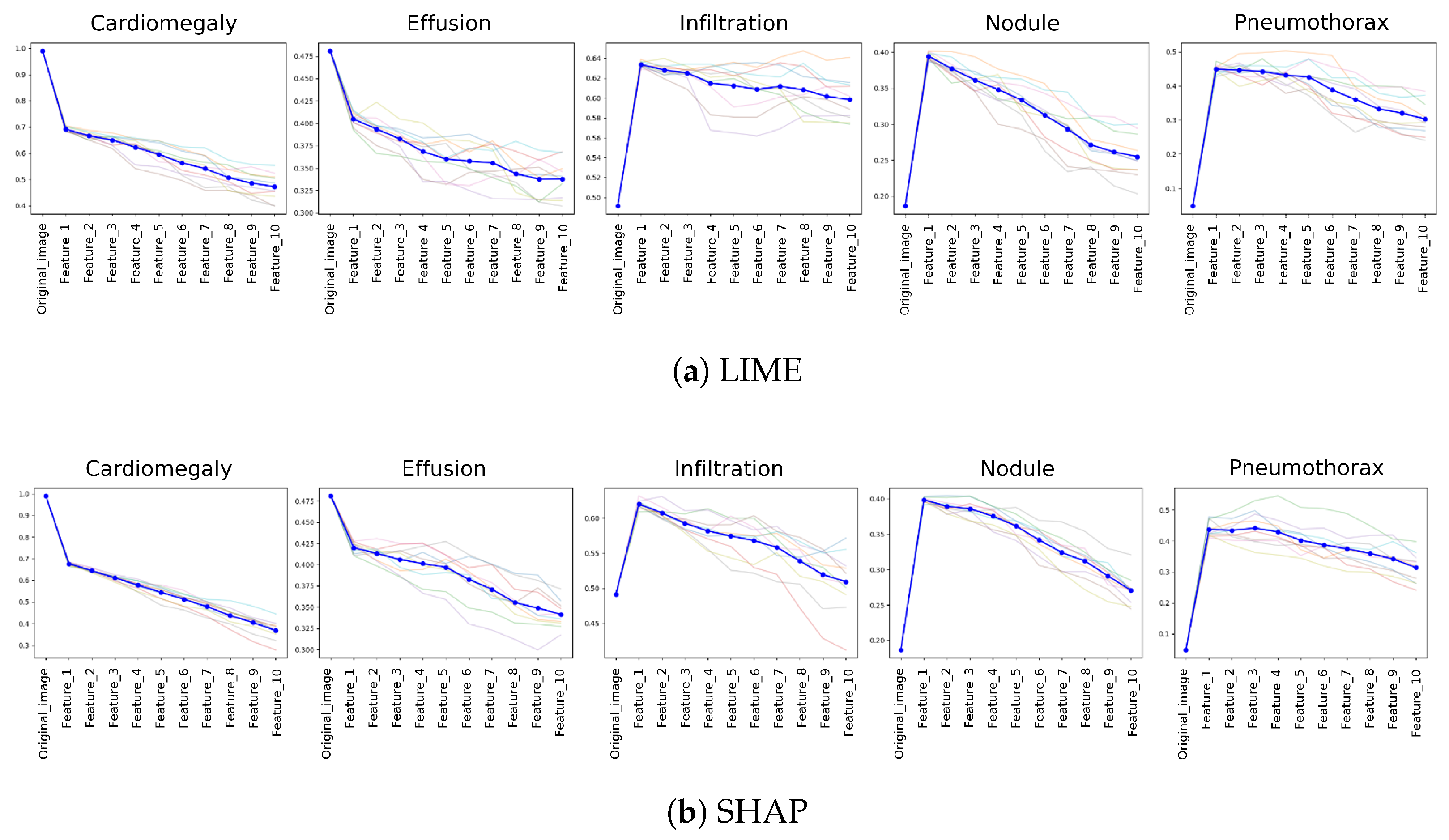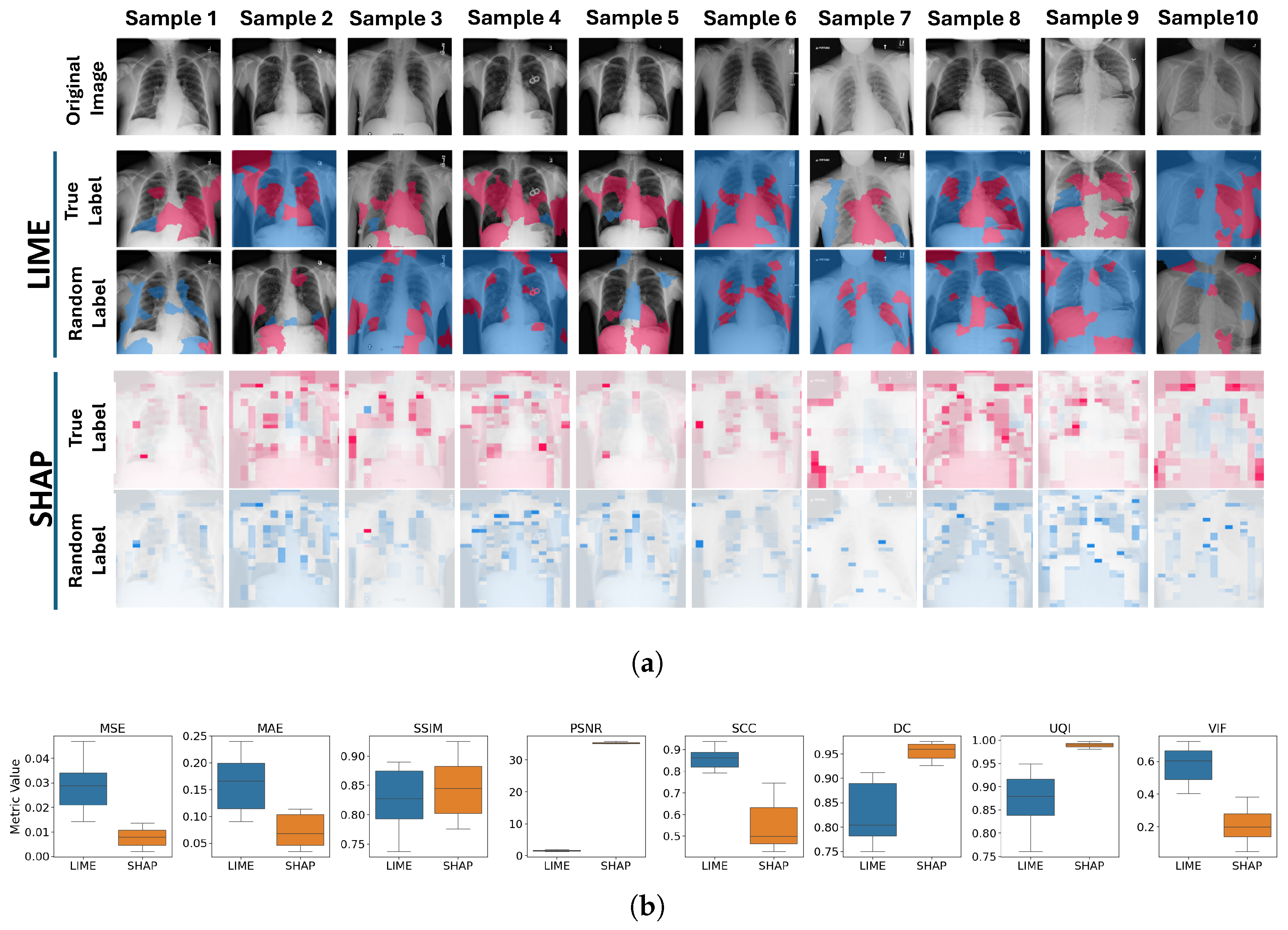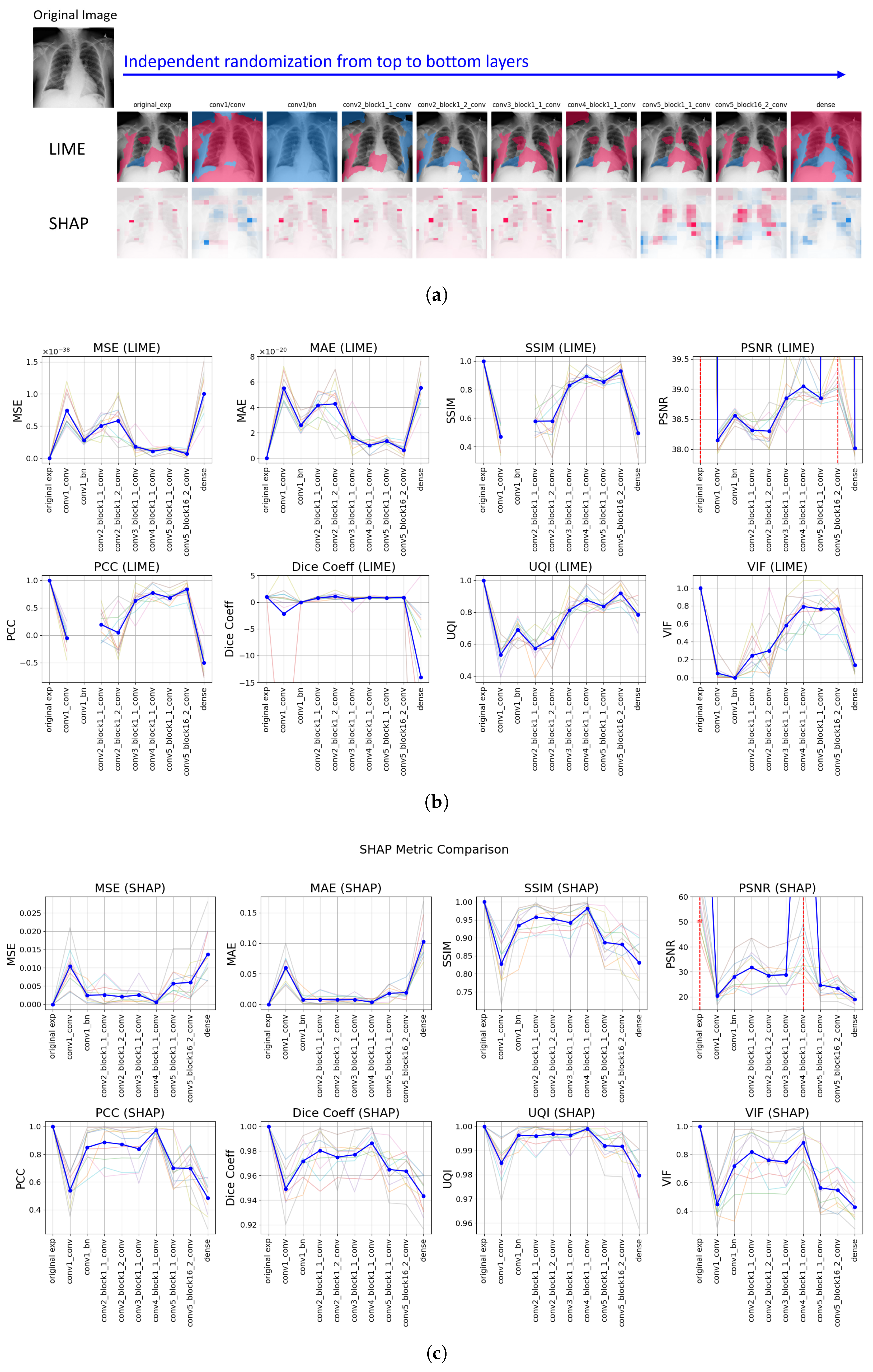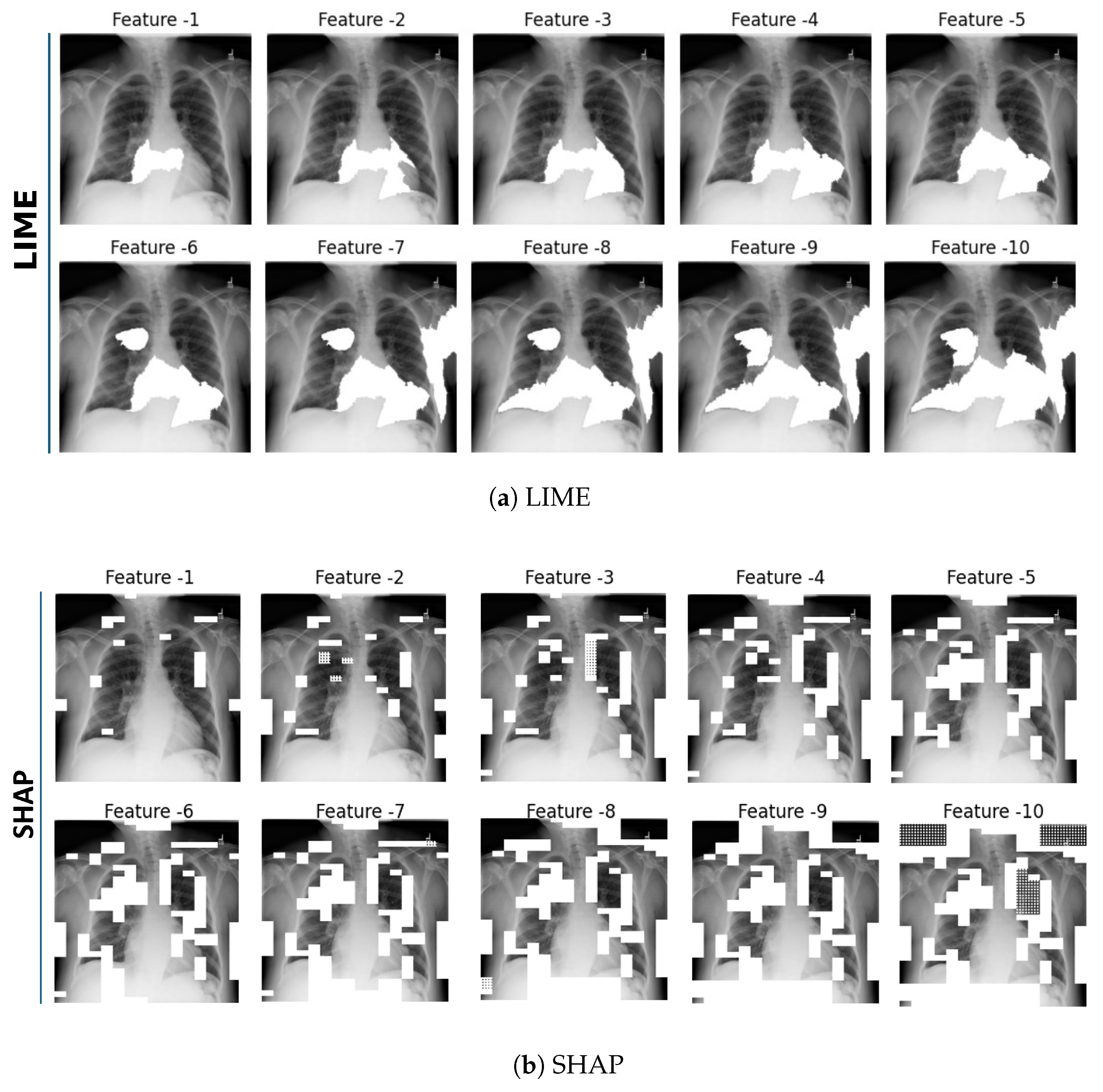18] implemented a comprehensive evaluation for the explanation of the segmentation in chest X-ray scan diagnosis. The main evaluation approach was based on the overlapping score between the LIME explanations and the ground truth. Not only was the overlapping score with multi-label consideration and the minimized discrepancy considered as a metric, but also informativeness, localization, coverage, multi-target capturing, and proportionality of the explanations. Lin et al. [
