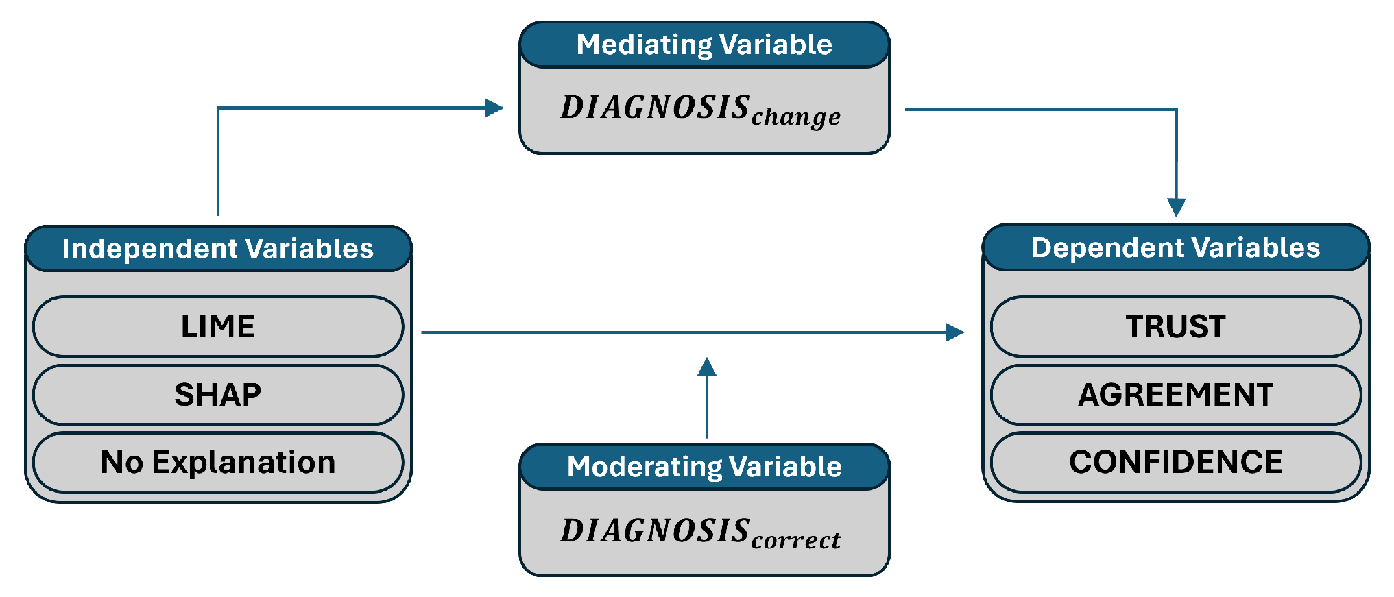 Although the mediation pathway for was statistically significant, its explanatory power was low (adjusted ), which indicates that the type of XAI method accounts for only a small portion of diagnostic revisions. This outcome aligns with the inherently multidimensional nature of clinical decision-making, where numerous cognitive and contextual factors influence whether clinicians revise their diagnoses beyond the presented explanations. These results provide an initial understanding of the behavioral impact of explanations; however, a more comprehensive user study focusing on diagnostic correctness and contextual factors would be valuable for deeper insights.