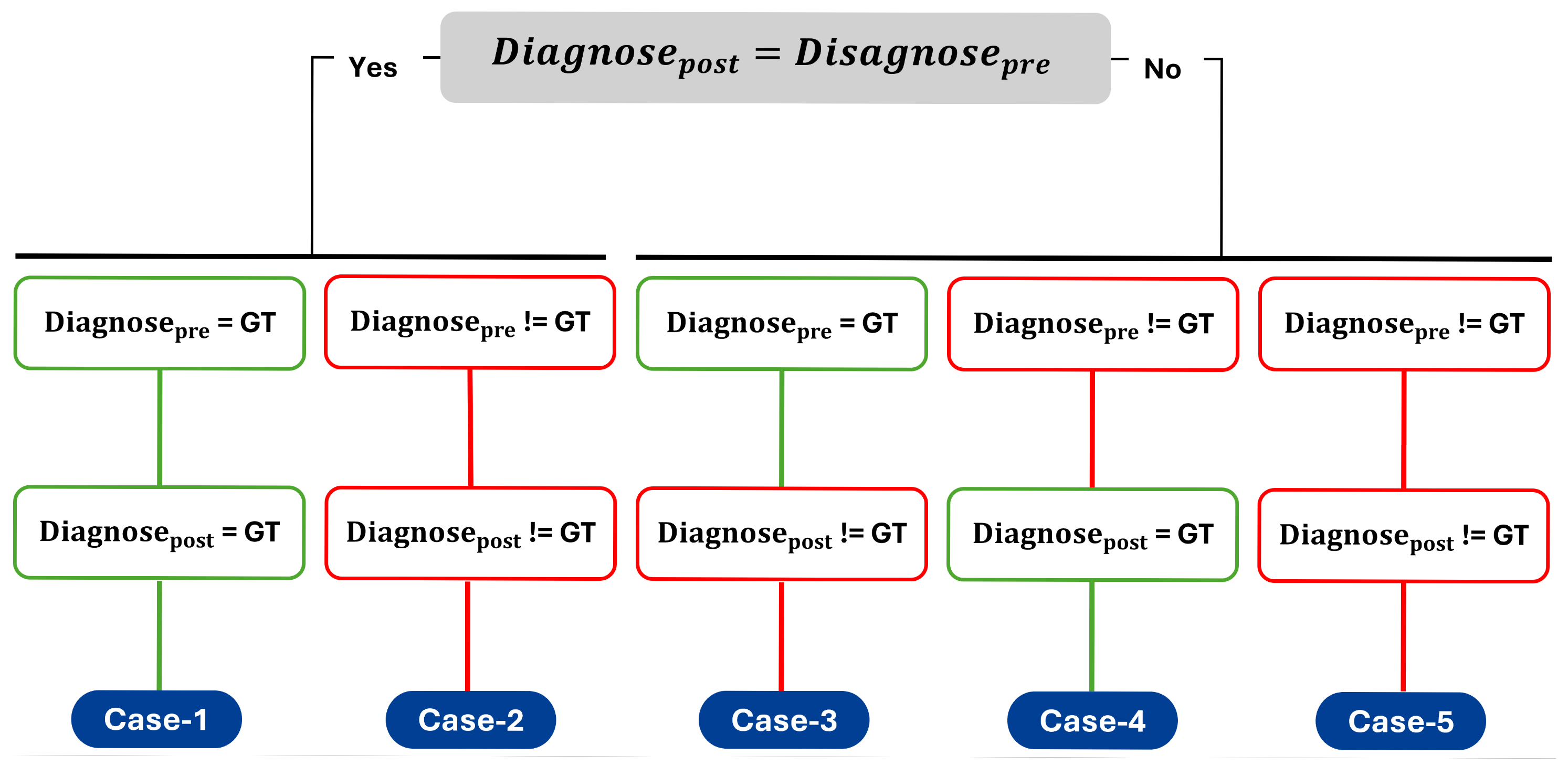For this analysis, five distinct cases were defined based on whether there was a change in diagnosis (). Once the diagnosis change was determined, the correctness of the initial and final diagnoses (, ) was checked. The cases were subsequently structured based on the combinations of these factors.