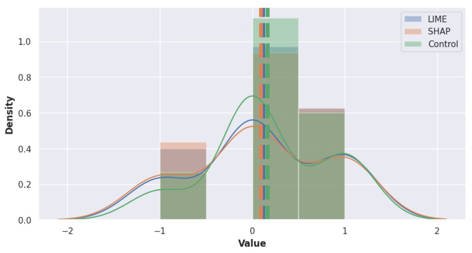 relationship, the Control group shows a weak negative correlation while LIME and SHAP groups have weak positive correlations. This indicates that higher