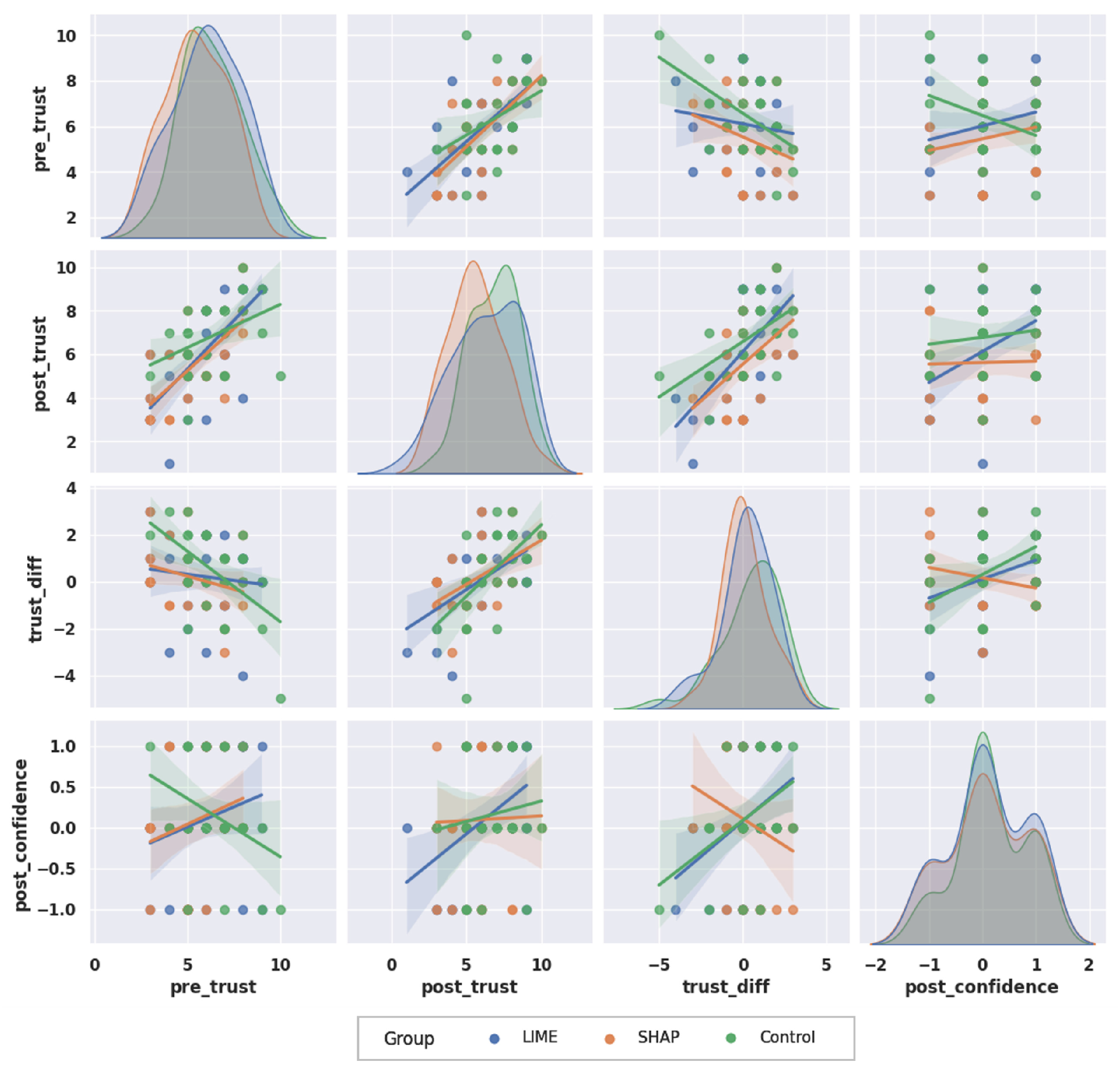 , the SHAP group has a distinct negative correlation, while the LIME and Control groups show strong positive correlations. This indicates that, for the SHAP group, an increase in trust difference tends to decrease post-confidence levels. By itself, this information seems vague; however, when the case-based analysis was applied (see