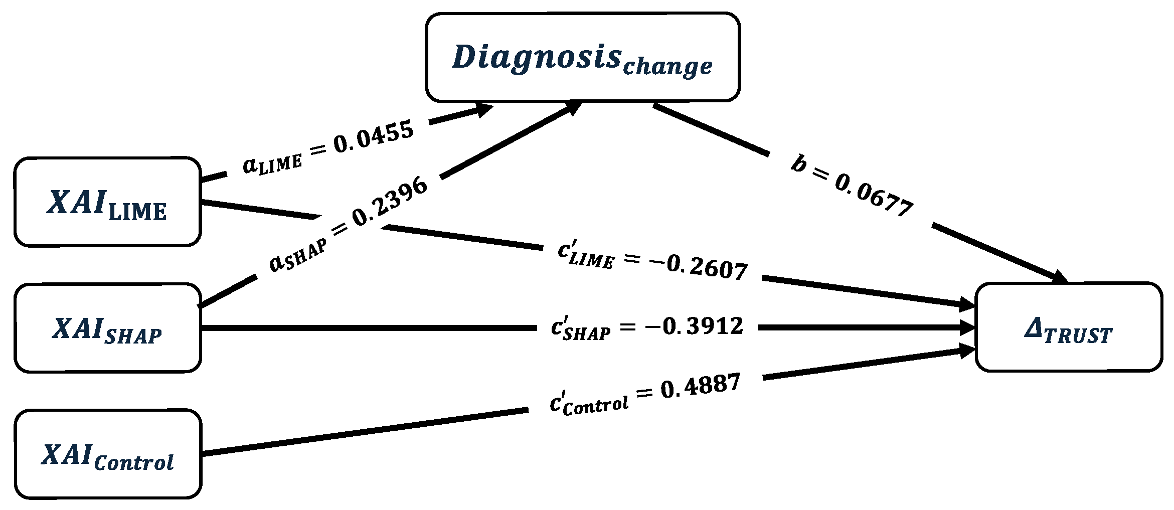 In the outcome model for , the coefficient estimation is 6.3153, which represents the mean value of the indications for the Control group. Since participants in this group rated the importance of indications as high, this baseline confirms that indications are indeed seen as important in the diagnostic process. The LIME group’s mean score is slightly lower than the Control group’s by 0.0958, but this difference is not statistically significant (p-value = 0.874). However, the SHAP group’s mean score is significantly lower than the Control group’s by 1.6093. This indicates that SHAP explanations may have either confused the participants or made them more critical of the AI’s diagnostic reasoning on indications. When participants changed their diagnosis from pre to post, their mean score decreased by 0.8916, though this result is not statistically significant (p-value = 0.124). Finally, the outcome model for reveals that both and have significant negative effect on . The effect is more pronounced for () than for . has a small, positive, but non-significant mediating effect on this relationship. This suggests that the decrease in is primarily driven by the direct effects of the XAI methods rather than by changes in diagnosis.