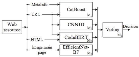 - A multimodal, late fusion architecture for the detection of phishing web resources is proposed. In this architecture, independent, specialized models for four modalities (CatBoost for URL features and metadata, CNN1D for symbolic URLs, a CodeBERT Transformer for HTML code, and EfficientNet-B7 for screenshots) are combined via a trainable meta-classifier that optimises the F1-score for the “phishing” class.