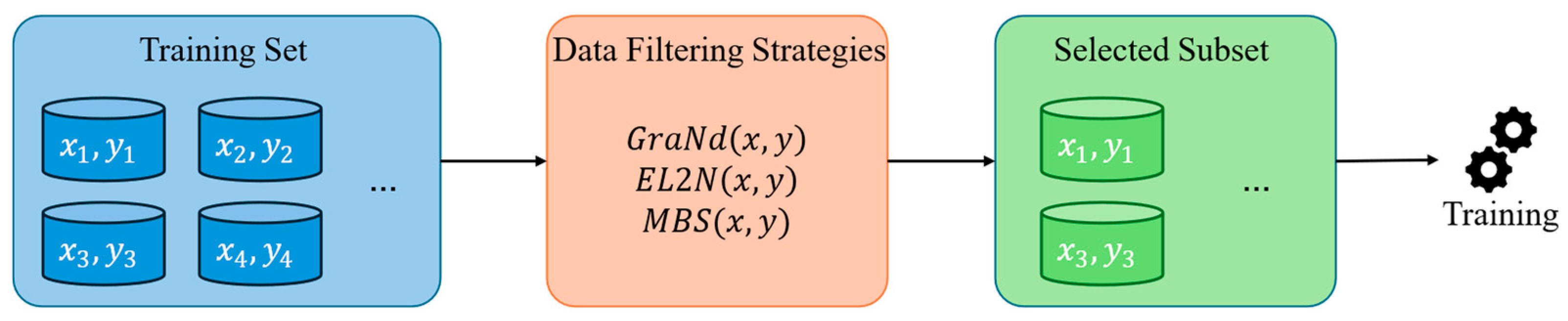 - Paul, M.; Ganguli, S.; Dziugaite, G.K. Deep learning on a data diet: Finding important examples early in training. In Proceedings of the Advances in Neural Information Processing Systems (NeurIPS), Online, 6–14 December 2021; Volume 34, pp. 20596–20607. [Google Scholar]