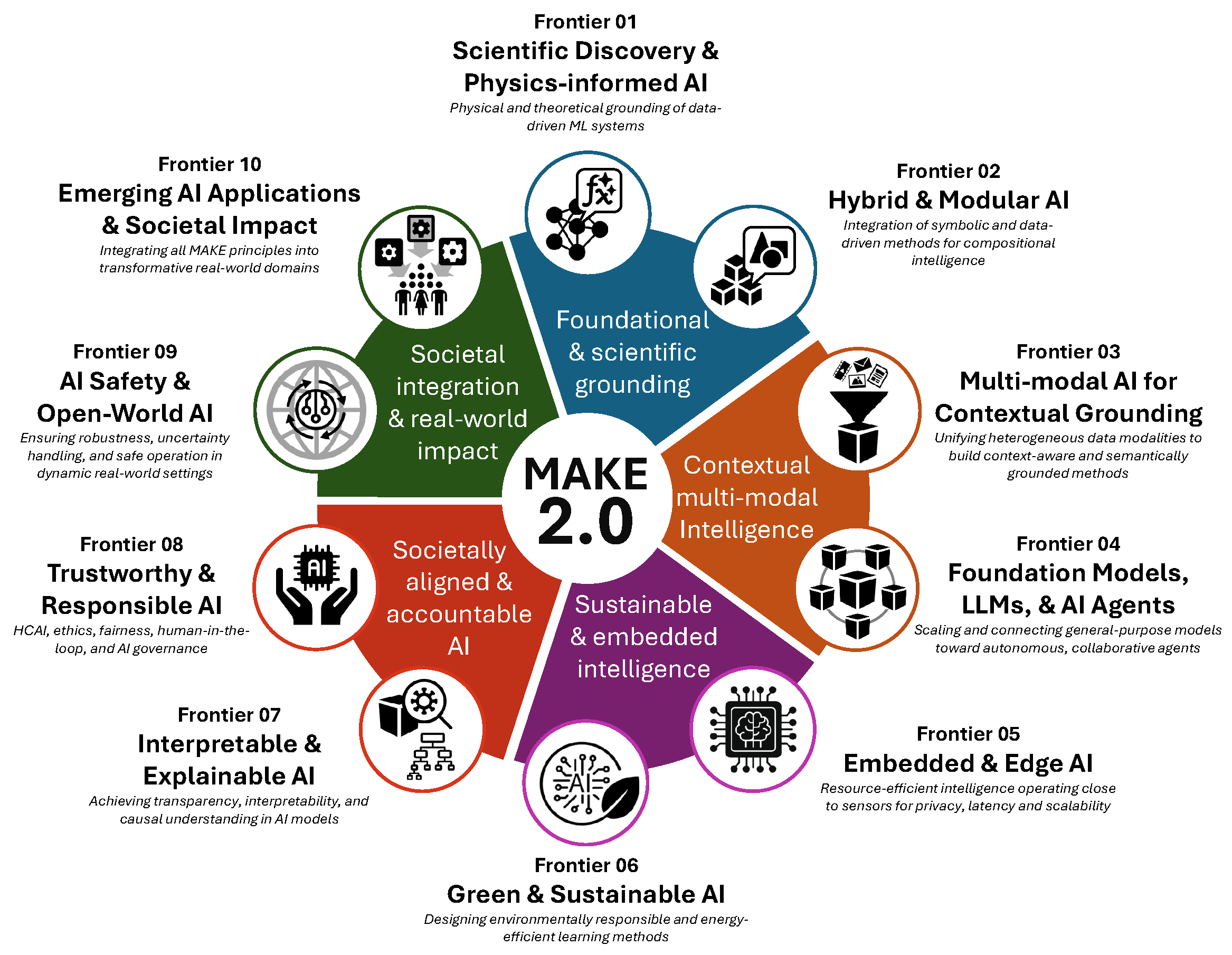 Each Frontier constitutes a fundamental dimension of the evolving MAKE landscape, spanning the scientific and computational foundations of AI to its broader societal implications and transformative applications. Collectively, these Frontiers delineate a coherent and holistic research trajectory that integrates knowledge extraction with interpretability, sustainability, and human-centred responsibility.