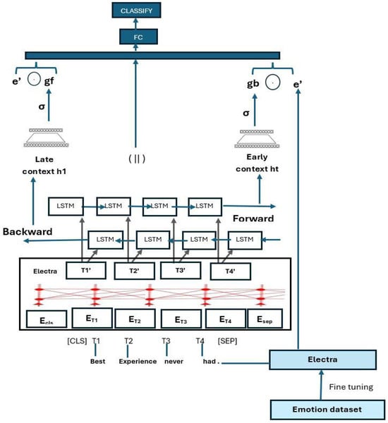 Bi-LSTM is a bidirectional extension of LSTM that processes sequences in both forward and backward directions to capture context from past and future time steps [33]. The proposed model uses a bidirectional LSTM that processes text embeddings in both forward (left-to-right) and backward (right-to-left) directions, and we utilise early textual context and later contextual texts to extract the emotional cues. For a sequence X = ( x 1 , x 2 x t ), where x t R d t e x t , hidden state updates in the forward direction are like