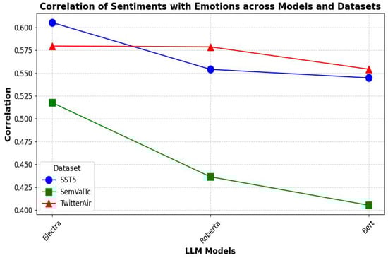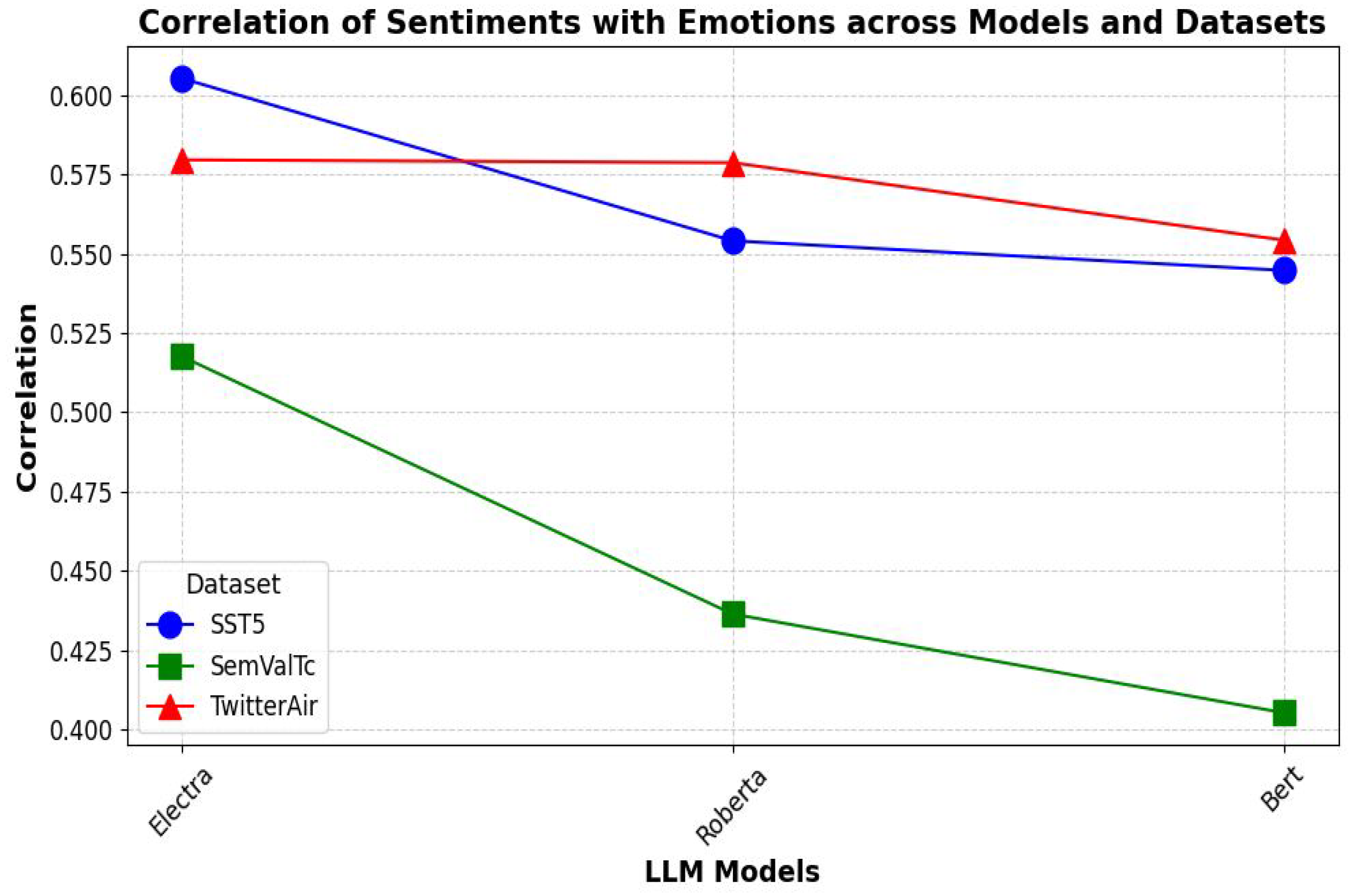 We fine-tuned BERT, RoBERTa, and ELECTRA on the GoEmotions dataset to generate emotion probability distributions and evaluated their correlation with sentiment labels on SST-5, SemEval-C, and Twitter sentiment datasets. We tested multiple LLMs—BERT, RoBERTa, and ELECTRA—because each captures emotional nuances differently due to their distinct pretraining strategies. This comparative evaluation ensured robustness and reduced model bias. Figure 2 shows the correlation between the predicted emotions by different LLMs and their correlation with sentiments.