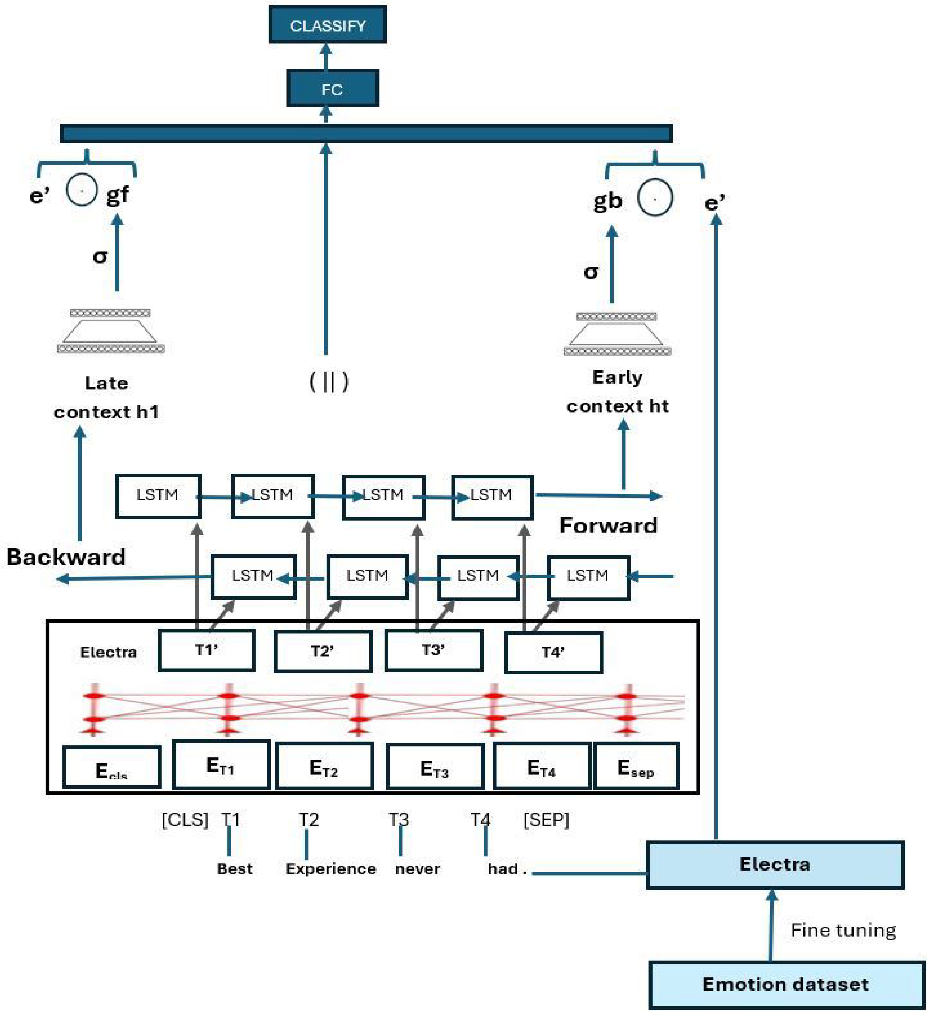 • Emotion-Aware Bidirectional Gating Mechanism: We introduce a novel gating architecture leveraging both early (forward) and late (backward) BiLSTM contexts to generate emotionally sensitive representations, enabling adaptive modulation of contextual semantics for fine-grained sentiment classification.