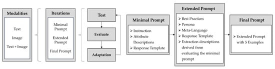 The image and text + image modalities showed small improvements, while the text modality exhibited a slight decrease in extraction quality. These results stem from a reduction in missing metrics and an increase in correctly extracted attributes, although some attributes became less accurate. The previously observed errors related to the misinterpretation of specific target attributes were removed through the examples. Still, after the prompt engineering process, 11.54–13.46% of metrics remained unextracted, and some misinterpretations persisted. Nevertheless, the results exceeded the target threshold of 80%, and the text + image modality performed slightly better than text alone on the attribute level. The improvement in F1 scores demonstrates the potential of few-shot prompting to enhance accuracy and completeness, and the final prompt can be used for the evaluation stage.