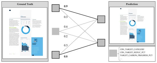 Because no established evaluation configuration exists for cases where multiple metrics may appear on a single page, a custom procedure was defined. Each extracted ESG metric on a page was matched to the corresponding ground-truth metric from the same page. The matching process consisted of two steps and is exemplified in Figure 4. First, every extracted metric was compared with every ground-truth metric on that page. This record-linkage step evaluated all classifiable attributes of a metric, counted the correctly matching attributes, and divided this value by the maximum possible number of correct attributes. The result was a set of all possible extraction-ground-truth combinations, each with an associated overlap score. Secondly, the optimal assignment was determined by maximizing total overlap. This assignment problem was solved using the Hungarian algorithm, which solved it as an equivalent minimization problem [35,36]. Alternative strategies, such as greedy matching, were considered but ultimately discarded. Greedy matching, which assigns the best immediate match iteratively, is prone to producing suboptimal global assignments [37], resulting in artificially low F1 scores when multiple similar ESG metrics (e.g., distinct targets for Scope 1 and Scope 2) differ only slightly in their attribute composition. In contrast, the Hungarian algorithm guarantees a globally optimal matching of predictions to ground truth, ensuring that the evaluation strictly assesses the model’s extraction capability.