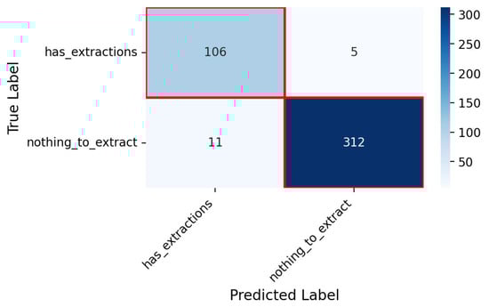 The page-level confusion matrix shows that five ESG-relevant pages were not identified (see Figure 5). Therefore, the model does not capture all relevant content, although most pages are detected. This is relevant for any practical deployment of the system.