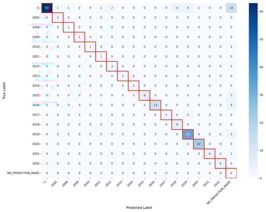The confusion matrix for the attribute CBN_TARGET_BASE_YEAR shows all classes of the test dataset and visualizes their unbalanced distribution (Figure 6). The extraction of this attribute achieved a weighted-average F1 score of 75.02%, a precision of 87.72%, and a recall of 70.28%.