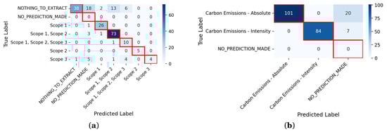 Confusion matrices of two attributes: (a) TARGET_CARBON_SCOPE_123_CATEGORY; (b) CBN_TARGET_CATEGORY.