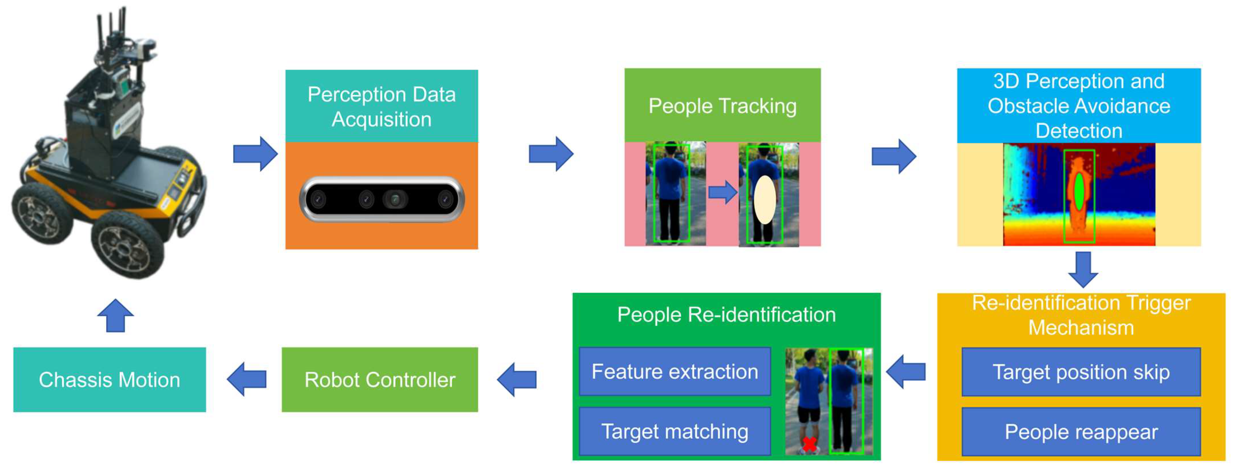 Furthermore, the ReID mechanism is not continuously applied to every frame. Instead, it is triggered only during critical events, such as suspected target switching, target disappearance, or reappearance, for identity verification and correction. Its main effect is to enhance identity consistency and robustness during long-term following rather than to improve short-term frame-level tracking accuracy. This characteristic allows the system to effectively avoid template contamination and identity accumulation under multi-person interference and prolonged operation.