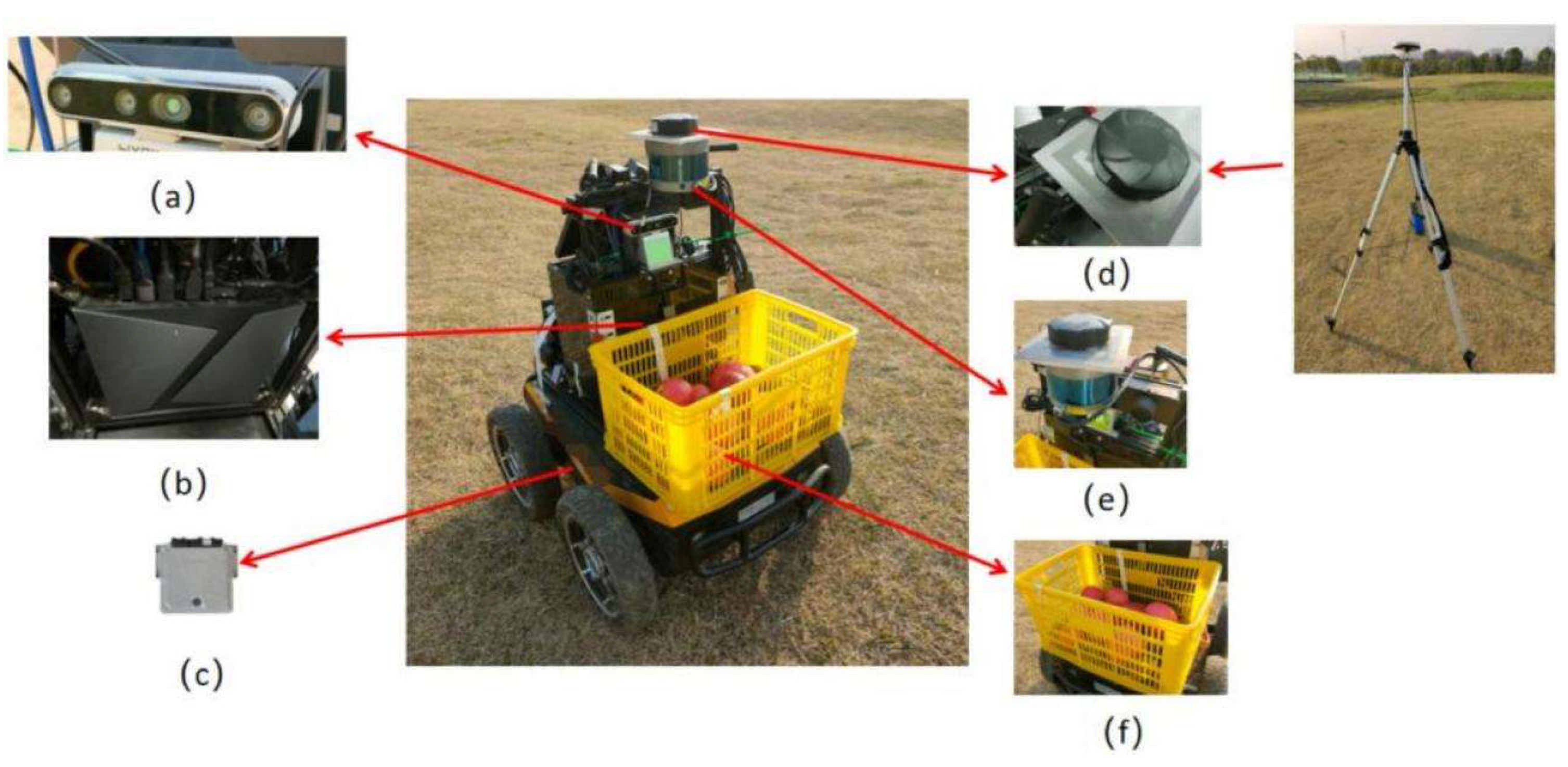 To facilitate the evaluation of target localization accuracy, a LiDAR sensor is additionally mounted on the robot. The LiDAR-measured target position serves as the ground truth, while the position obtained by the proposed target localization method serves as the estimated value. Target localization experiments are conducted along the main orchard pathways, between rows of fruit trees, and in grassy areas, as illustrated in