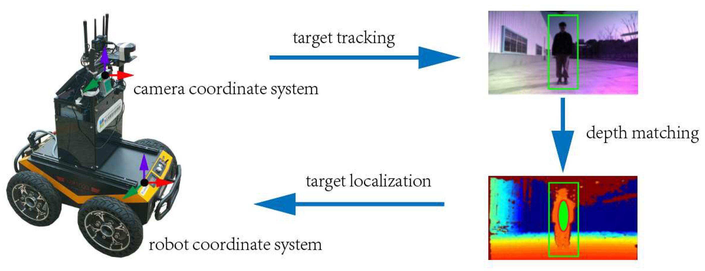 Due to the use of an elliptical mask for depth extraction, no failures caused by missing depth values are observed. The main sources of deviation include errors in the ground-truth measurement process, RealSense depth measurement errors, errors in computing human coordinates, and inaccuracies in depth extraction caused by imperfect bounding-box predictions of the DIMP algorithm. Although a certain deviation exists between the measured and estimated target positions, its impact on the overall system performance is negligible. Therefore, the proposed target tracking and localization method satisfies the requirements for tracking target localization accuracy.