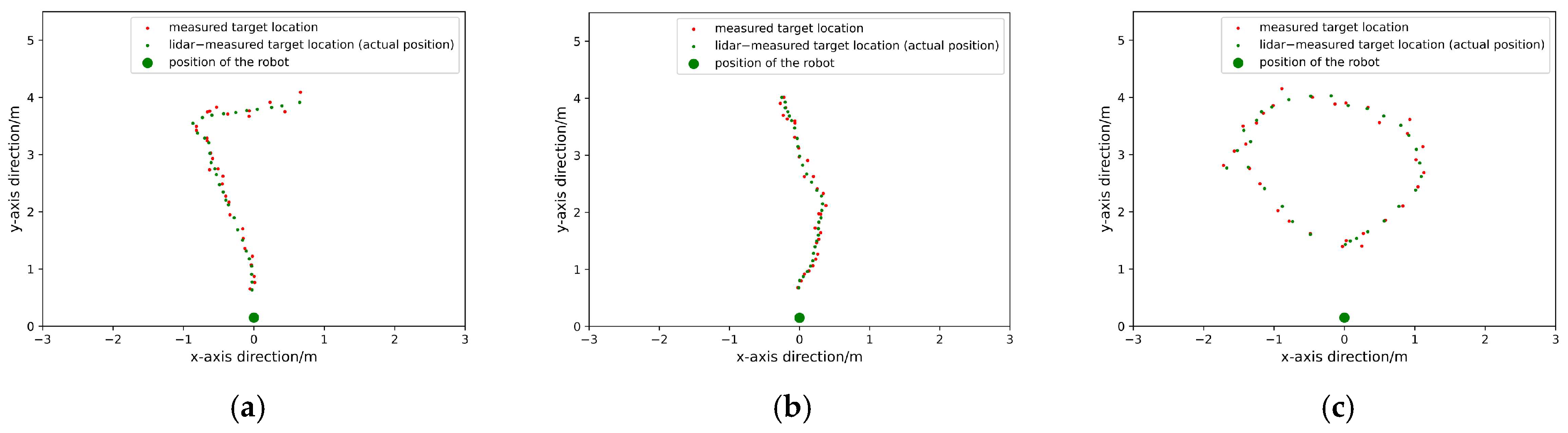 Figure 16a–c, where red points indicate the positions obtained by the proposed method and green points indicate the actual target positions. Euclidean distance is used as the deviation metric, as defined in Equation (4):