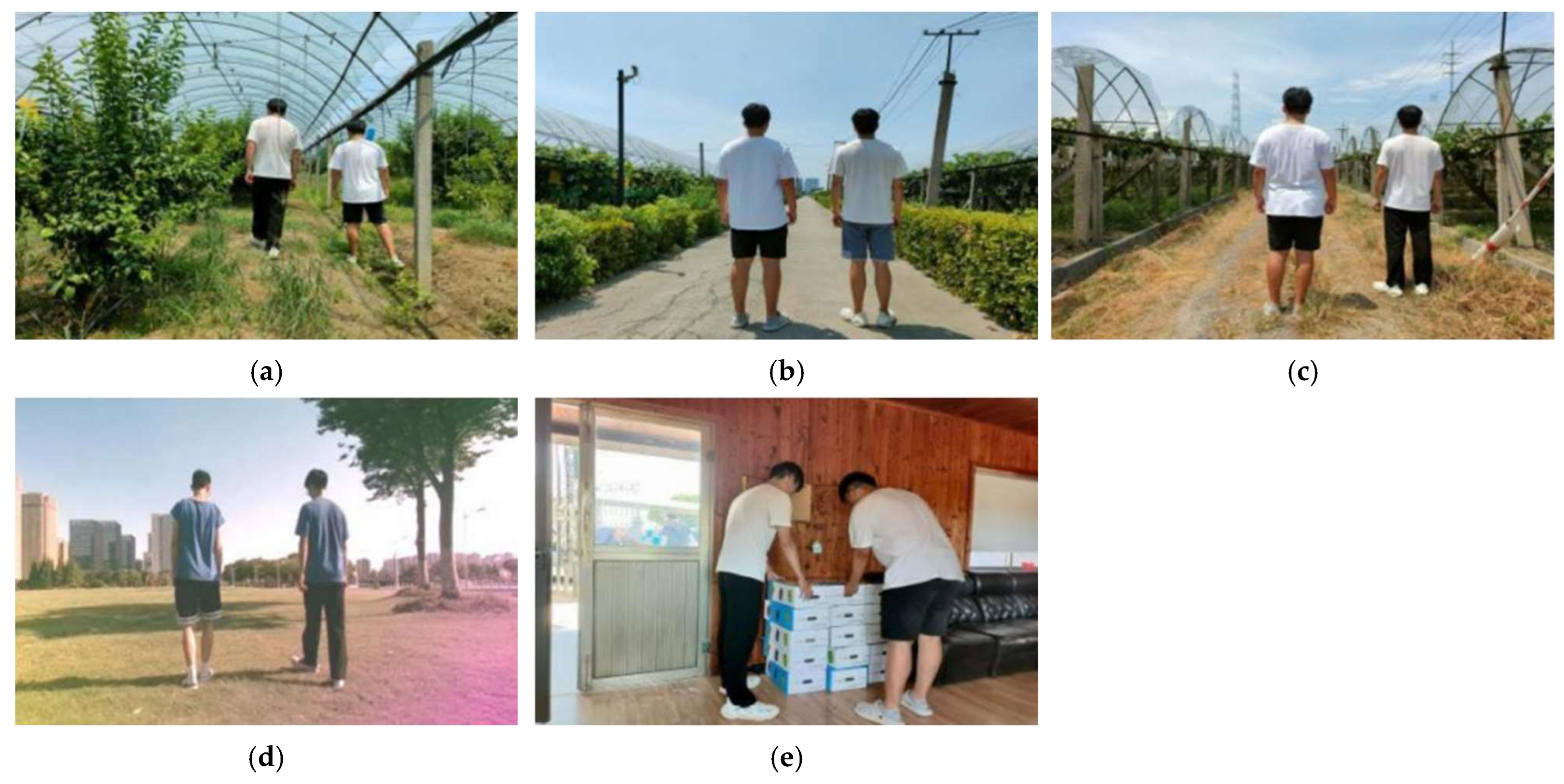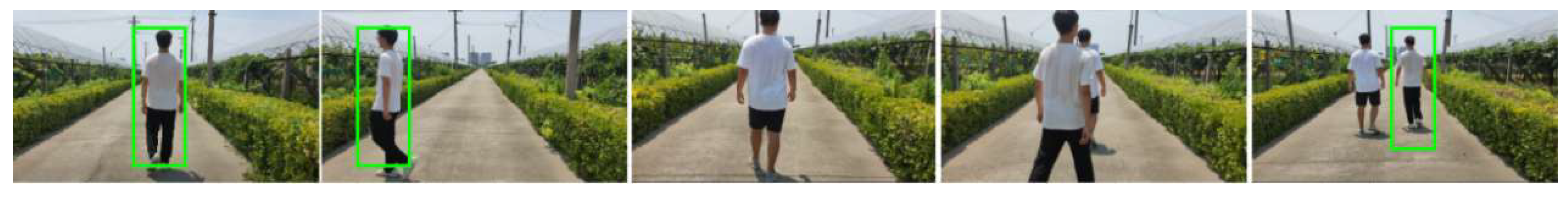 Figure 17. Four typical interferences are introduced: multiple people present simultaneously (seven participants in total, with one target and six distractors; four-angle images of each participant are collected in advance to construct the ReID feature database), target pose variations, short-term disappearance and reappearance, and target switching due to occlusion. The test data are collected in the Bacheng vineyard and surrounding areas of Kunshan, Suzhou, Jiangsu Province, covering main orchard pathways, rows of fruit trees, indoor aggregation areas, and open grassy areas. The robot followed the target under human operation, with the above interferences intentionally introduced.