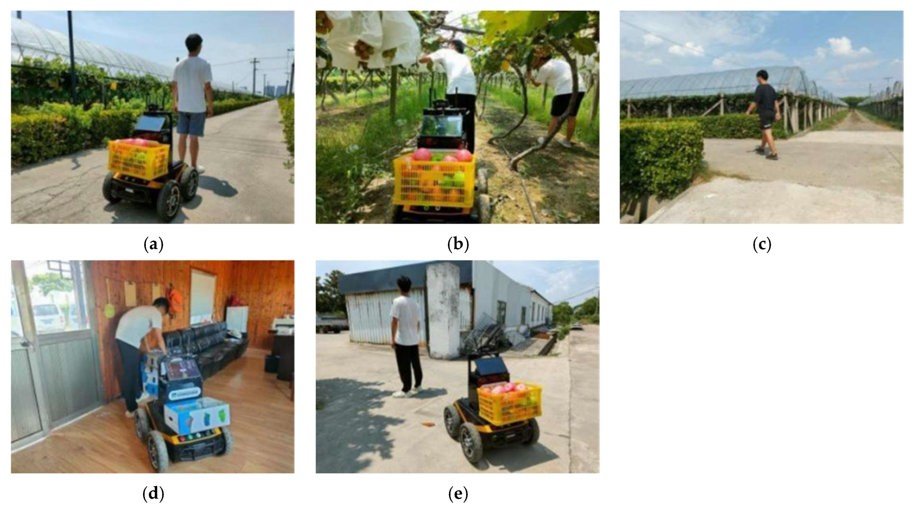 Figure 19a–e illustrate the field experiment scenarios. When the robot loses the target, it stops and waits until the correct target reappears before resuming motion (