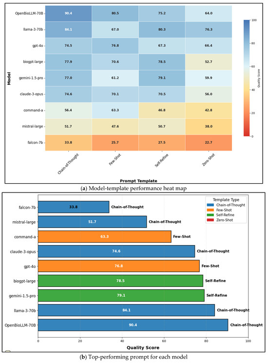 - Domain-specialized biomedical models: OpenBioLLM-70B and BioGPT-Large contribute clinical and biomedical knowledge through pre-training on PubMed and domain corpora, enabling evaluation of terminology capture and domain-reasoning fidelity [46,47]. They combine large-scale biomedical pre-training with strong reasoning ability, bridging the gap between general and domain-specific performance. BioGPT-Large, though smaller, serves as a lightweight reference model to examine how prompt engineering can offset limited scale and context capacity.