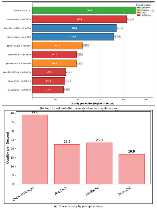 In these equations, the subscripts m and t refer to the model and template type, respectively, utilized in evaluation. Specifically, m indexes, the nine large language models analyzed (e.g., GPT-4o, Claude-3-Opus, LLaMA-3-70B, OpenBioLLM-70B), and t describes the prompting strategy used (Zero-Shot, Few-Shot, CoT or self-refine). Thus, each metric is a quantification of the combined quality, cost, and efficiency of a particular model–template combination, allowing for standardized comparison across systems and reasoning modes. The two metrics were scaled, capping denominators at small constants (0.001 USD, 0.1 s).