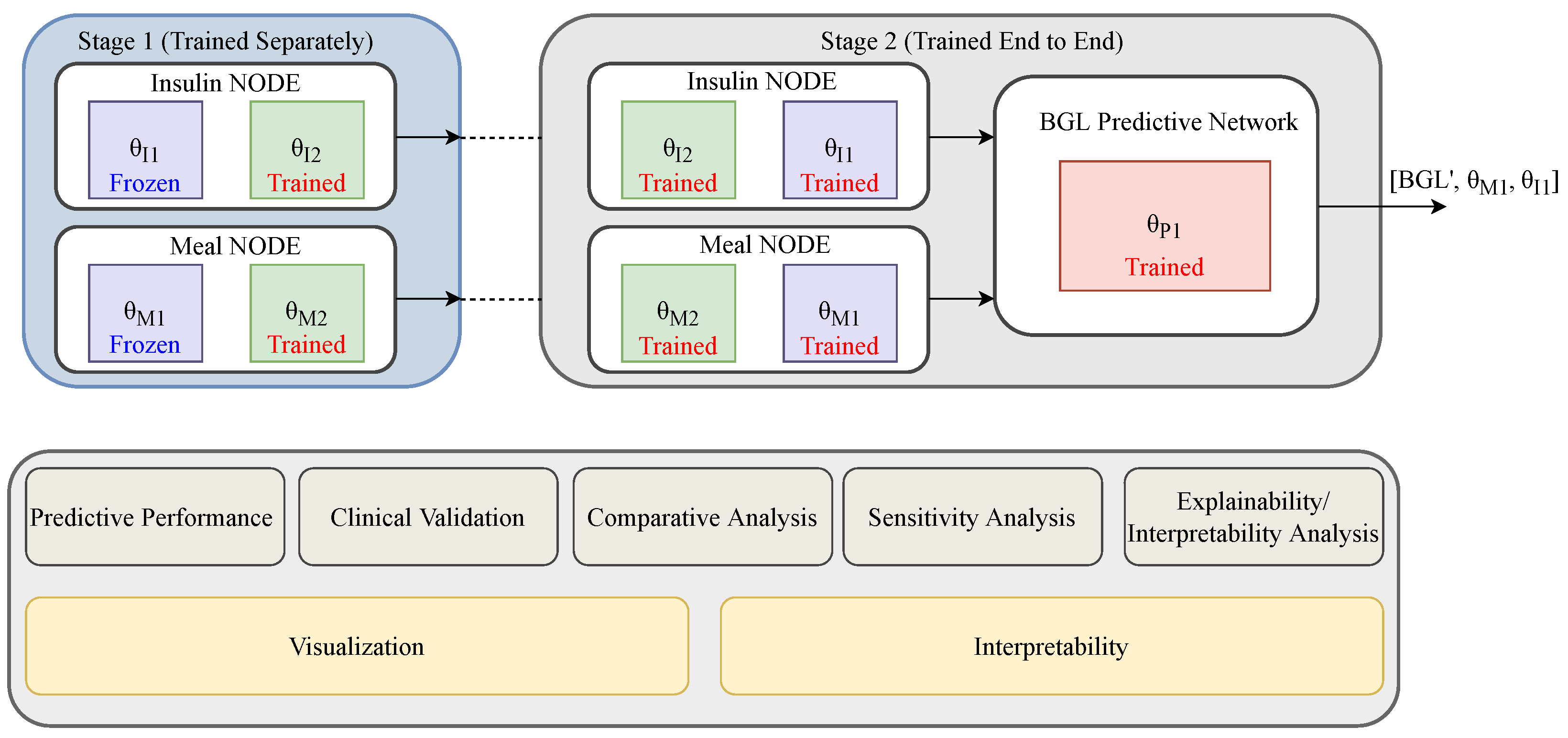 39], individual parameter estimation remains unrealized. The present work addresses these limitations and extends the state of the art in three meaningful directions. First, it moves beyond existing approaches that either embed physiological parameters as fixed constraints to enforce physiological plausibility in loss function or use them merely as static input features by making key parameters trainable and subject-specific, enabling individual-level parameter estimation from real-time data. Second, the proposed Neural ODE (NODE)-based approximation of insulin and meal kinetics offers greater flexibility than fixed-parameter ODE solvers, enabling adaptation to inter-individual variability through a two-stage transfer learning strategy that pre-trains on population-level data to capture general physiological dynamics and subsequently fine-tunes on individual patient BGL data. Third, the sensitivity and counterfactual analyses provide a structured framework for clinical interpretability that most competing methods, including MTL-LSTM, SAN, and GAN-based data-driven approaches, entirely lack. Together, these contributions address the gap that no existing framework simultaneously achieves: interpretable parameter estimation from free-living CGM data, robust individual-level personalization, and counterfactual analysis.
