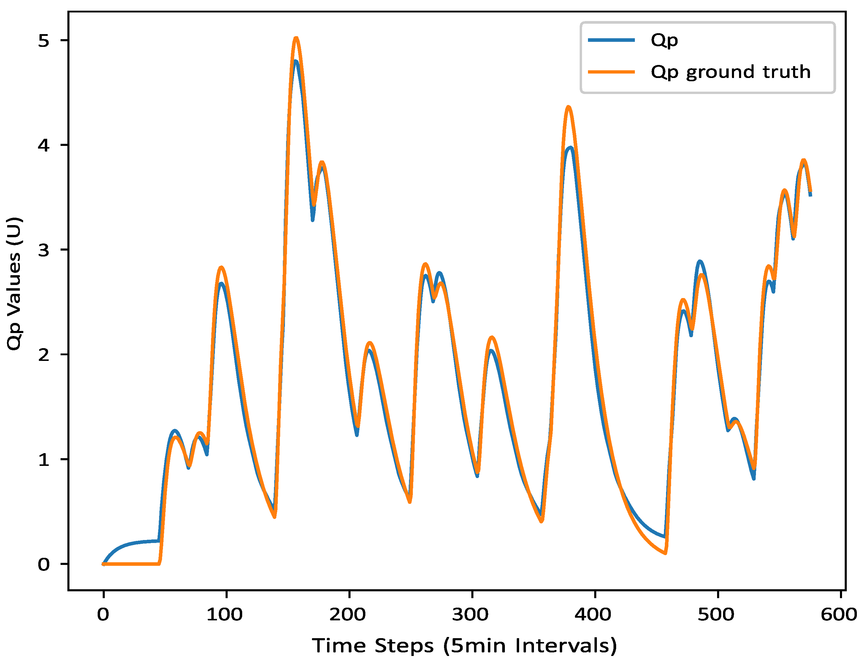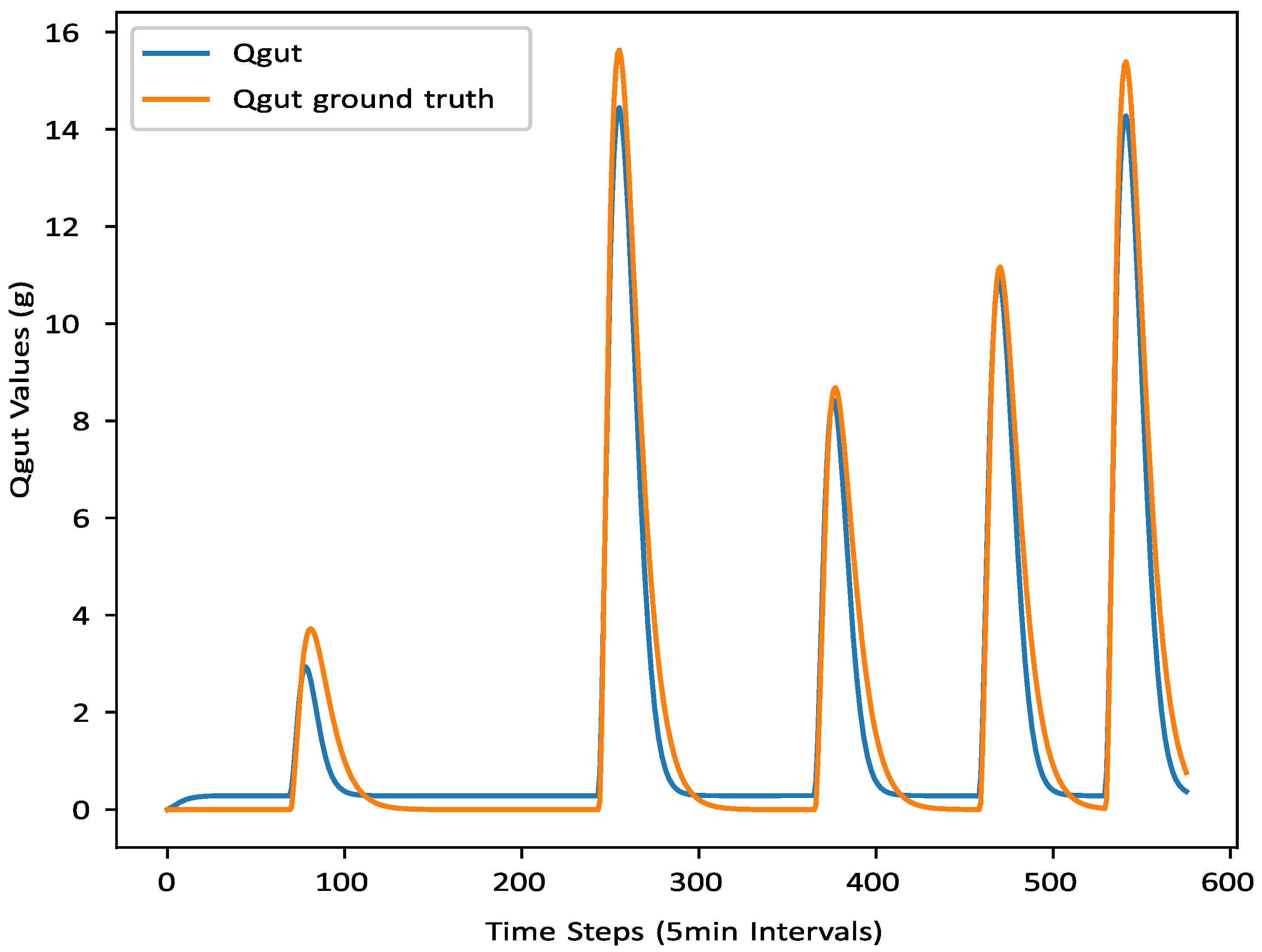 37] focuses on glucose simulation rather than pure prediction, proposing physiologically constrained neural network digital twins. Their approach constructs a neural state-space model aligned with a system of biological ODEs, where each equation is approximated by a dedicated neural network restricted to the same inputs as the original equation. The model is trained to both accurately simulate glucose dynamics and maintain physiologically consistent internal states. Rather than estimating explicit physiological parameters, the neural network weights implicitly encode the system’s dynamics. Personalization is achieved by augmenting the population model with an additional individual-specific network that learns residual dynamics from each person’s data.