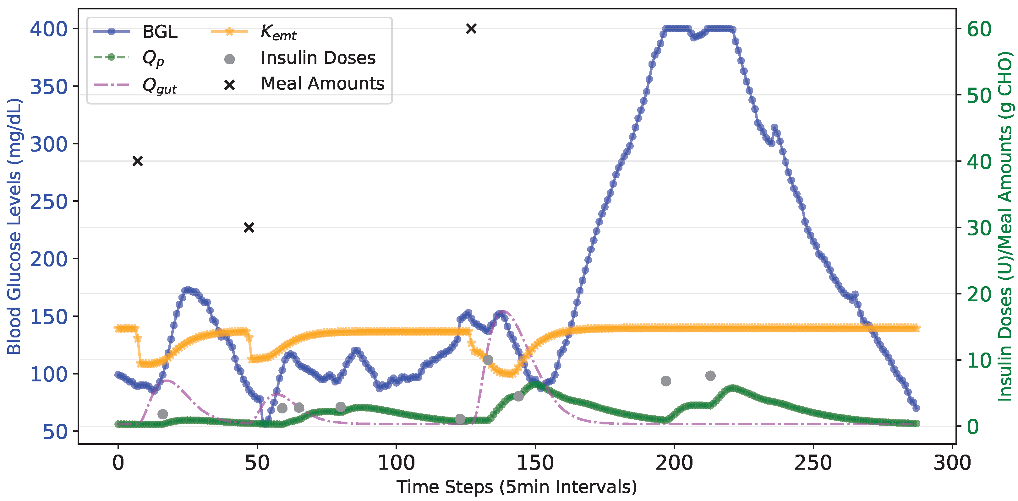 A potential limitation in existing data-driven BGL predictive models is their ability to accurately represent insulin and meal dynamics. When bolus insulin is administered, its effect on BGLs is not immediate; rather, it follows a time-dependent pattern, entering the bloodstream, peaking at a certain point, and gradually declining [