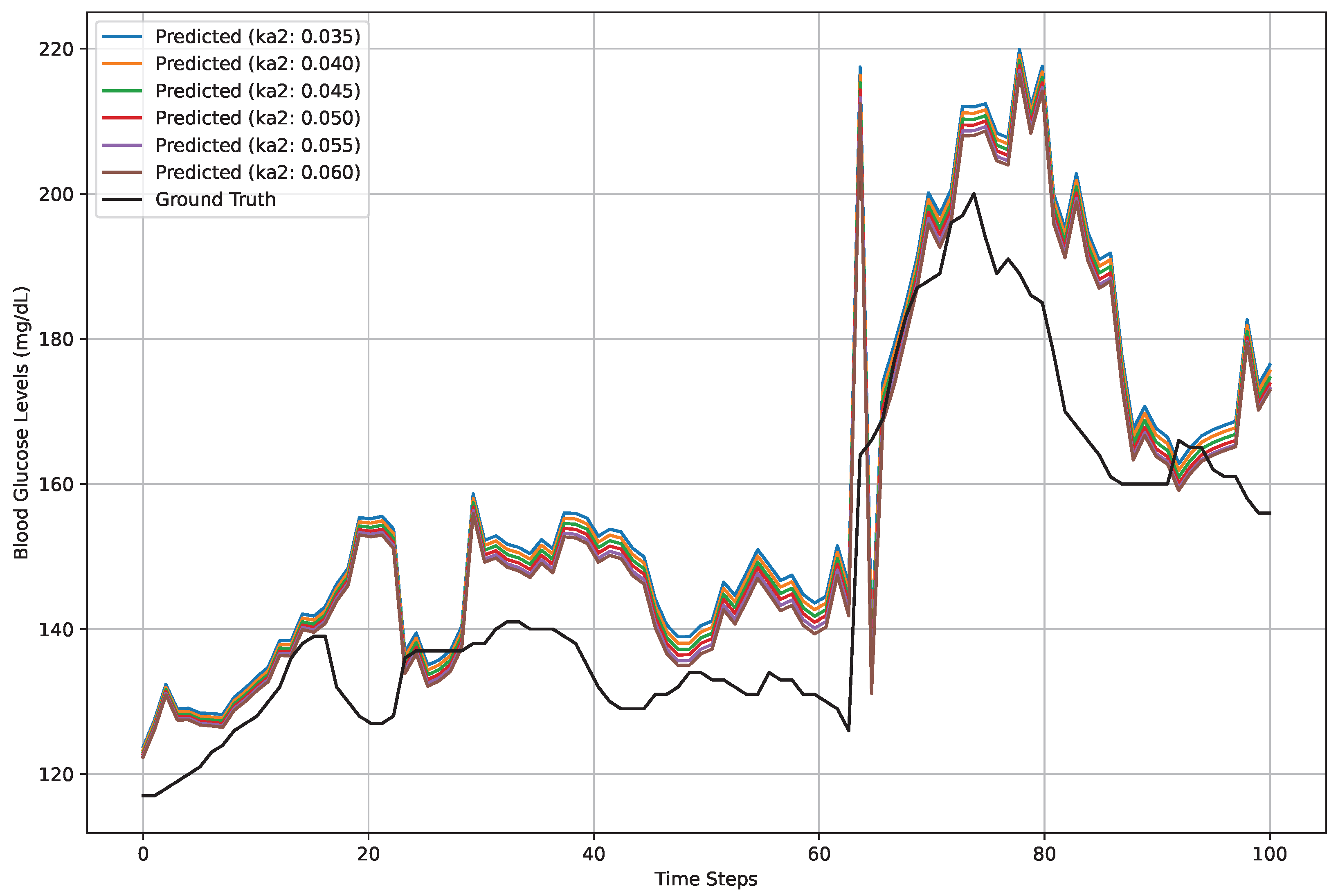 Hybrid modeling approaches combining physiological ordinary differential equation (ODE) knowledge with neural networks have emerged as a promising direction for glucose–insulin dynamics modeling. Ref. [
