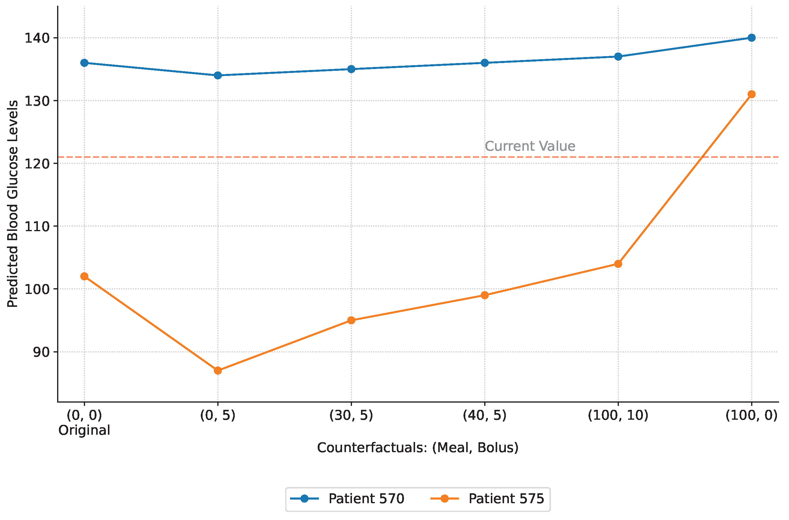 The framework incorporates sensitivity and counterfactual analyses, demonstrating how changes in insulin dosing and carbohydrate intake affect predicted glucose trajectories, offering both predictive accuracy and physiological explainability.