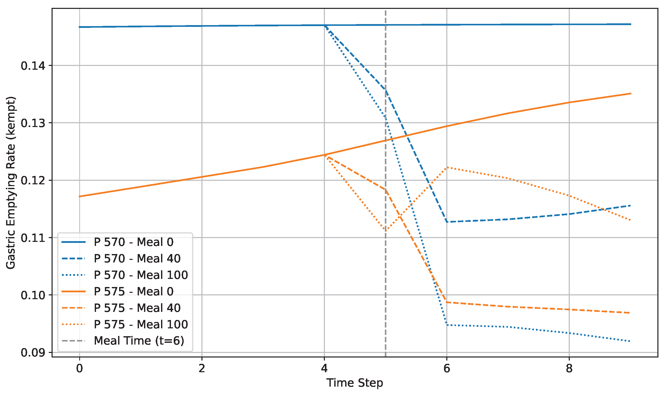 26]. A simplistic model that relies solely on insulin dose and administration time might not fully capture this gradual influence on BGLs. Instead, a more detailed approach that considers fluctuations in insulin concentrations over time could offer a clearer representation of glucose responses. Likewise, meal-related glucose appearance rates could play a more significant role than just the total meal amount and timing. Incorporating insulin kinetics, meal-related glucose appearance rates, and other physiological parameters could enable predictive models to better reflect real-world glucose dynamics.