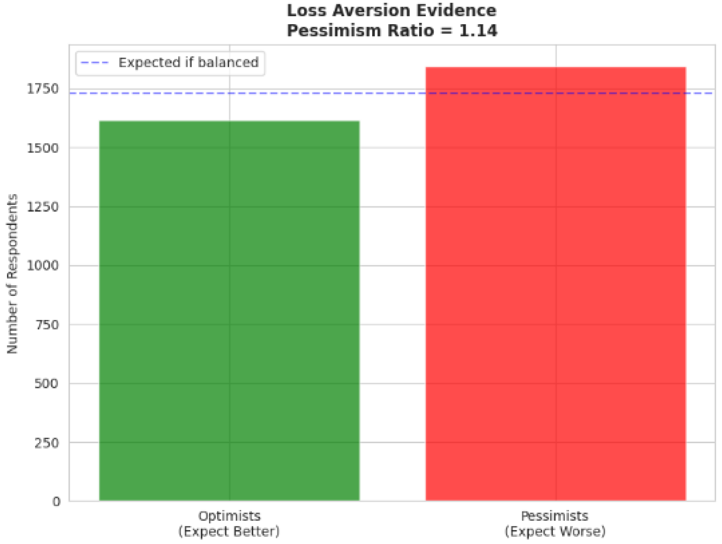 RQ1—Loss aversion in prospective economic perception: Yes. Pessimists outnumber optimists at a 1.14:1 ratio ( vs. ), and this asymmetry persists among respondents who rate current economic conditions positively, confirming loss aversion as a prospective heuristic independent of retrospective assessment.