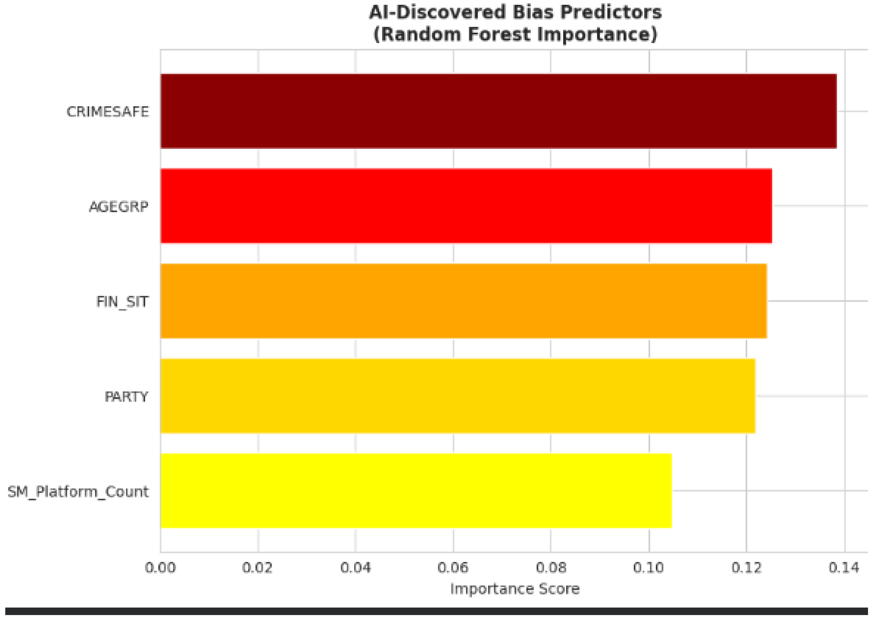 RQ4—Threat perception vs. partisan identity as bias predictor: Threat perception dominates. Crime safety perception (CRIMESAFE, 13.85% importance) ranks first in Random Forest feature importance, exceeding party affiliation (12.18%), consistent with availability heuristic dominance.