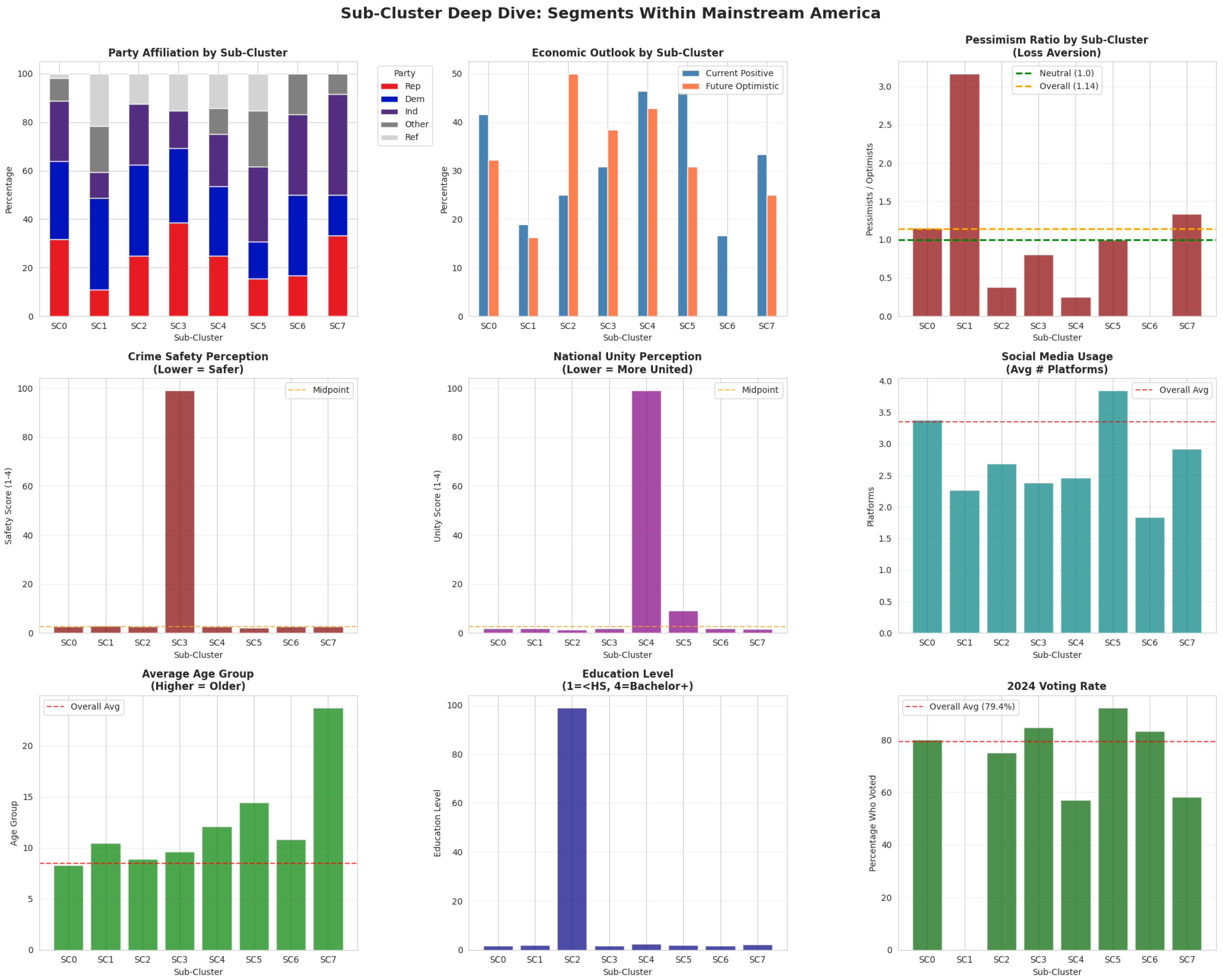 Several sub-clusters exemplify this pattern. The dominant Independent Pragmatic segment (97.5% of the Mainstream) contains nearly equal proportions of Democrats, Republicans, and Independents, united by moderate economic optimism, multi-platform digital engagement, and high civic participation. The symmetry between Senior Democratic Anxious and Senior Republican Anxious sub-clusters—both characterized by economic pessimism, minimal digital engagement, elevated threat perception, and high voting propensity—demonstrates that partisan labels can mask deeper commonalities rooted in generational experience and information environment. These are not opposed political tribes but parallel manifestations of the same underlying cognitive and demographic configuration.