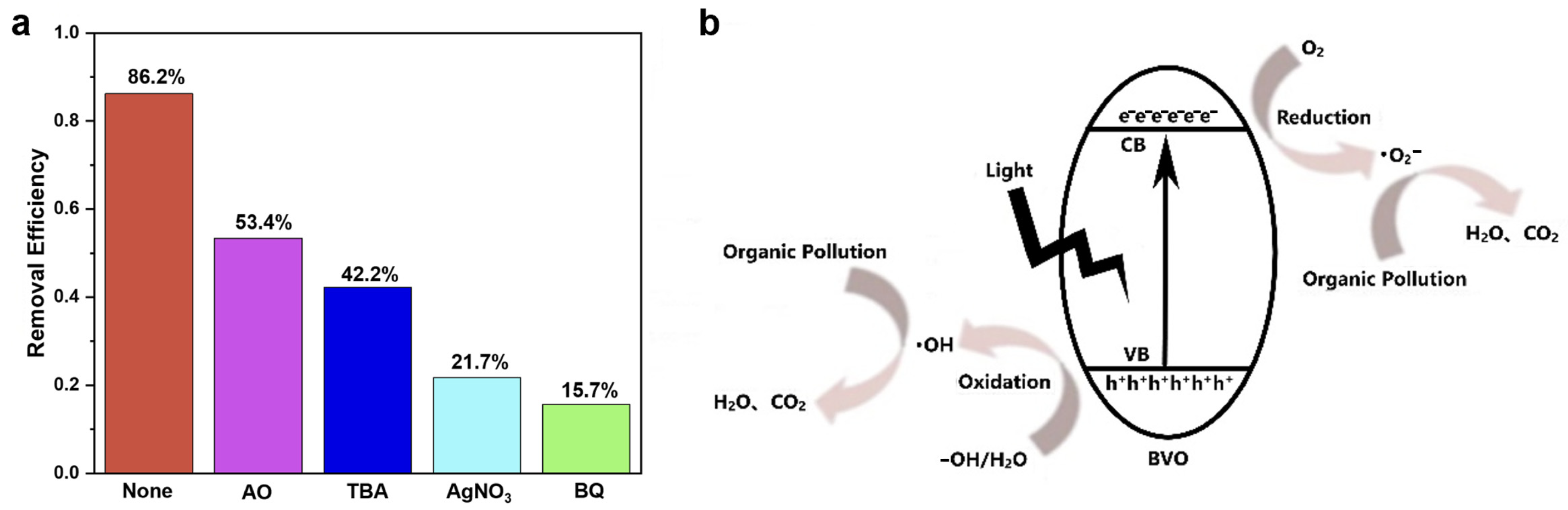 - Zhou, T.; Liu, J.; Zhan, H.; Wang, P.; Chao, K.; Chen, M.; Zheng, J.; Fu, B. Facile preparation of BiVO4/Bi-MOF composites for photocatalytic dye removal. J. Phys. Chem. Solids 2024, 188, 111917. [Google Scholar] [CrossRef]