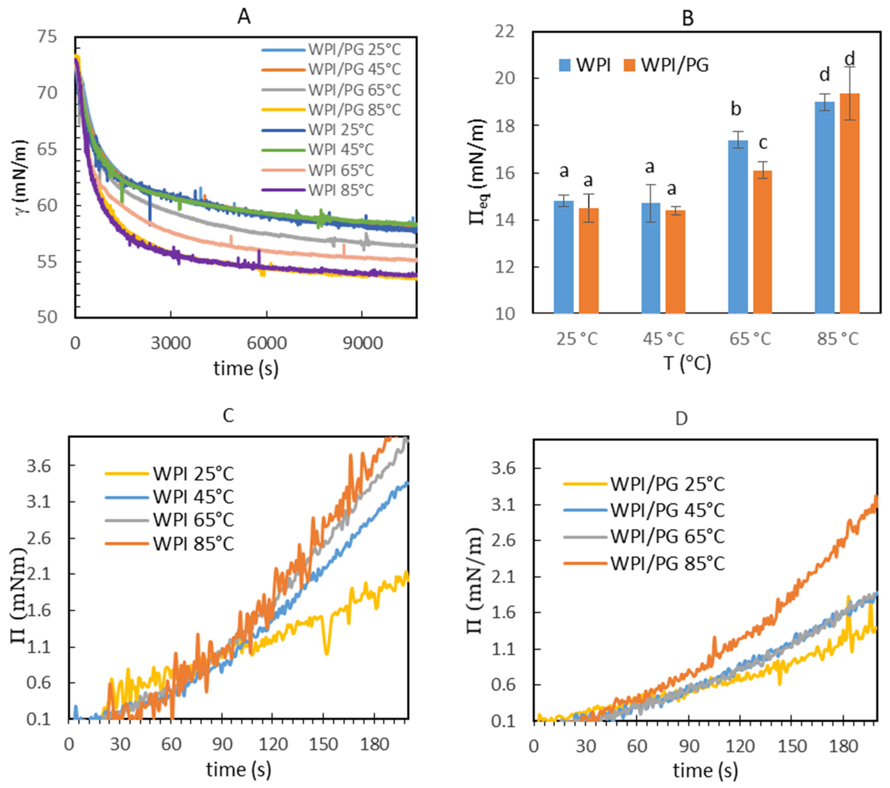 Figure 2. (A) Dynamic surface tension, (B) equilibrium surface pressure of WPI and WPI/PG at different temperatures, T °C, (C) dynamic surface pressure for pure WPI, and (D) mixed WPI/PG solutions during first 200 s of adsorption after 30 min heat treatment at different temperatures. The solution concentration was reduced to 10−4 mg/mL. Values with the same superscript (a,b,c,d) at (B) are not significantly different from each other (p > 0.05).