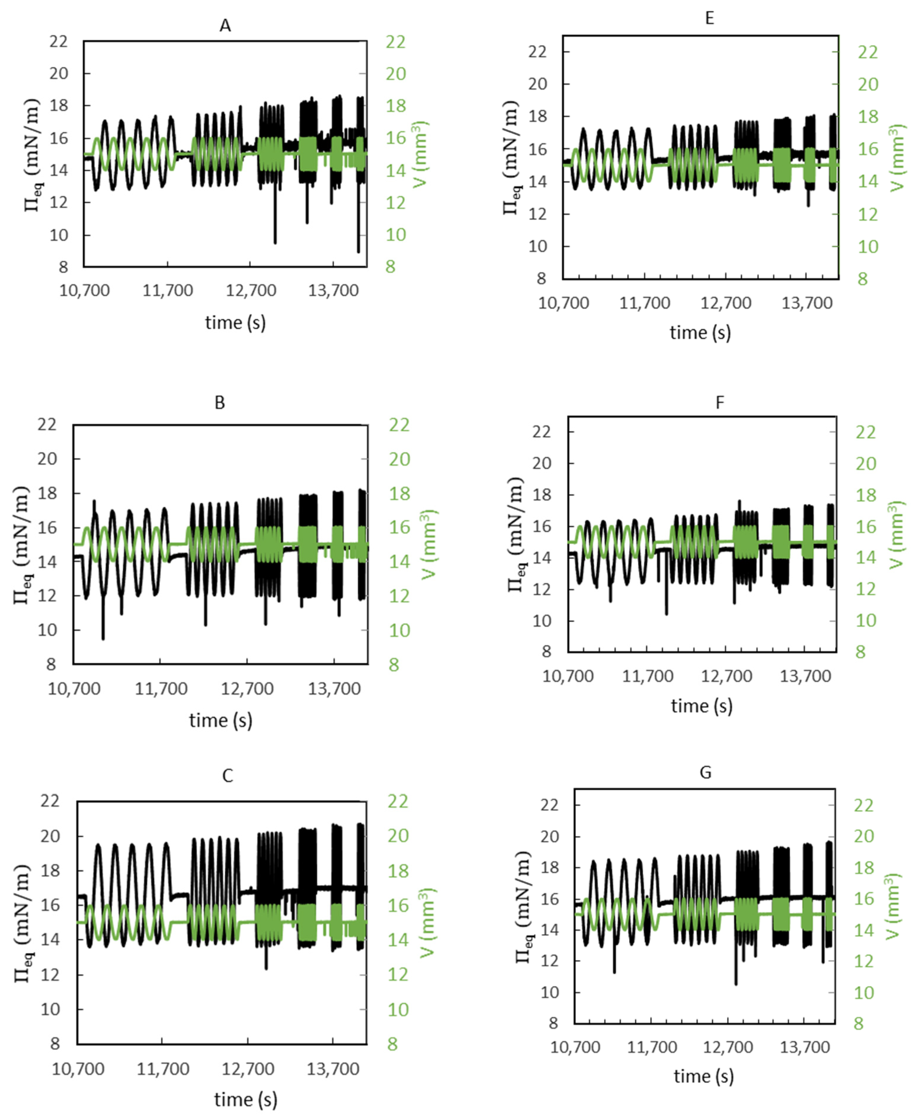 Figure 3. Evolution of the surface pressure with time (black lines, left axis) during sinusoidal volume changes (V = 15 ± 1 mm3 green curves, right axis) for WPI after heat treatment at (A) 25 °C, (B) 45 °C, (C) 65 °C, (D) 85 °C and mixed WPI/PG at (E) 25 °C, (F) 45 °C, (G) 65 °C, (H) 85 °C for solutions at a total concentration of 0.01 mg/mL.