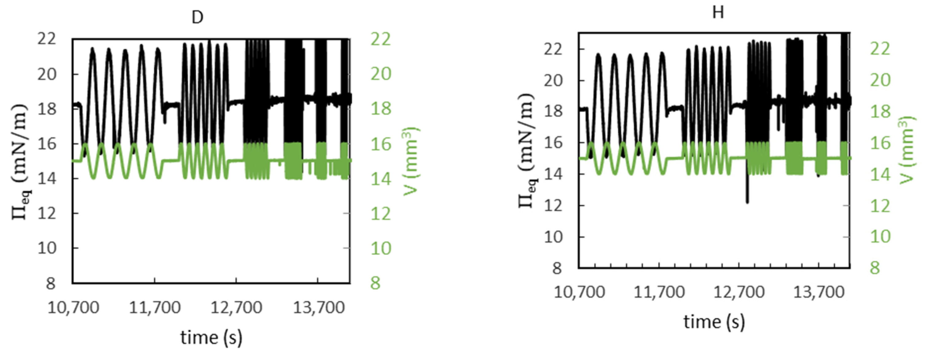 Figure 3A–H shows the surface pressure response to the sinusoidal volume changes (15 ± 1 μL) at six frequencies applied sequentially.