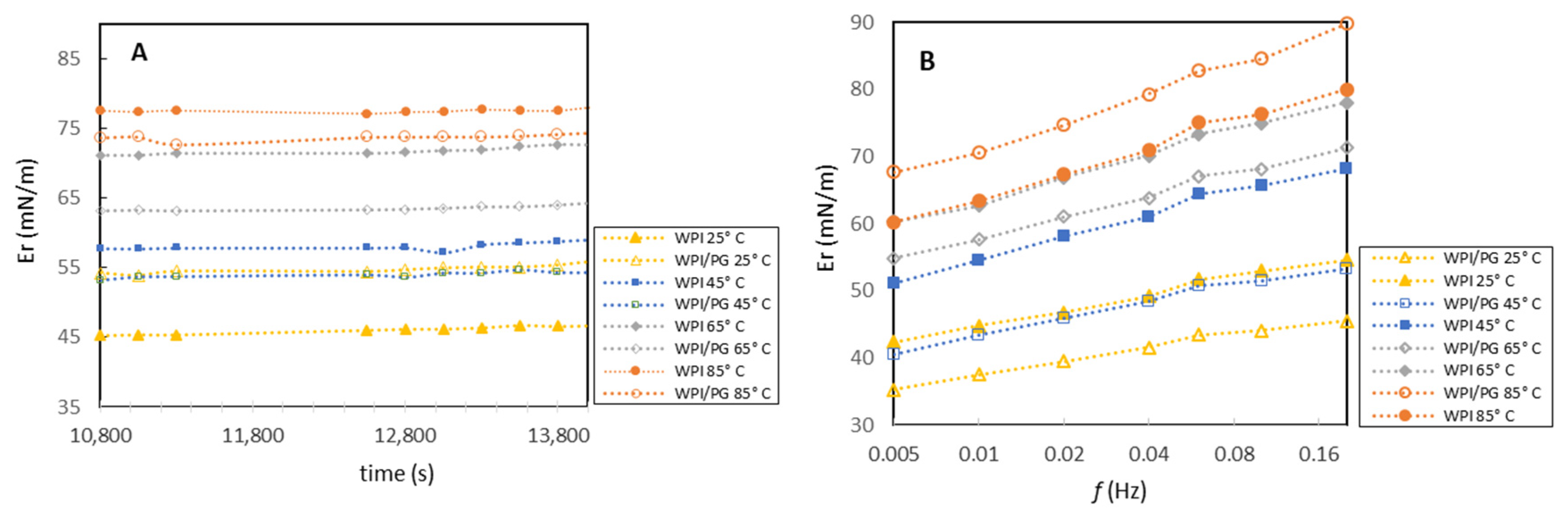 Figure 4. (A) Time-dependent dilatational surface elastic modulus (Er) at constant frequency 0.16 Hz, (B) Frequency-dependent dilatational surface elastic modulus of WPI and mixed WPI/PG solutions at a total concentration of 0.01 mg/mL after 30 min; all measured for samples heat treated at different temperatures.