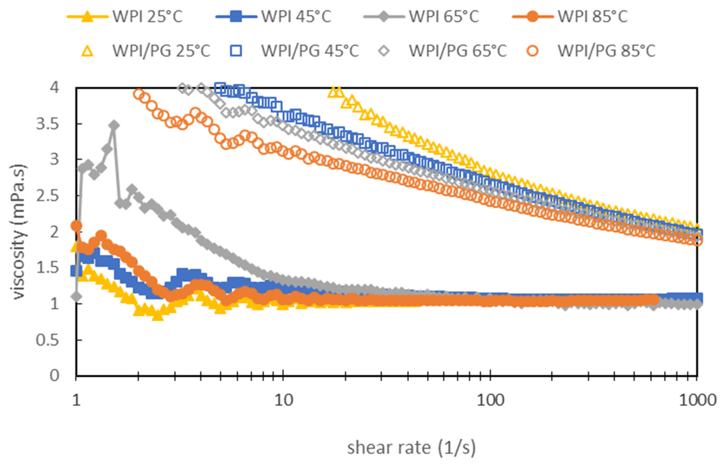 The study focused on comparatively high concentrations of both WPI and PG to ensure relevance to real food dispersion applications, where such levels are commonly used to achieve desirable texture and stability.
