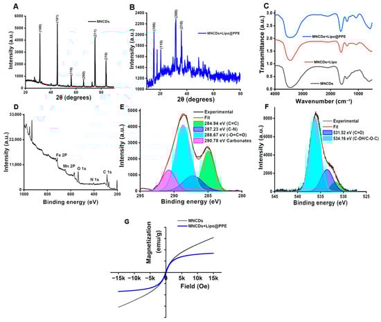 (A) X-ray diffraction (XRD) pattern of MNCDs showing the characteristic cubic spinel ferrite reflection. (B) XRD spectrum of MNCDs+Lipo@PPE indicating preservation of MNCD crystallinity with an additional amorphous contribution from the lipid bilayer and PPE coating. (C) FTIR spectra of MNCDs, MNCDs+Lipo, and MNCDs+Lipo@PPE. (D) Survey XPS spectrum of MNCDs. (E,F) High-resolution deconvoluted XPS spectra of C 1s and O 1s. (G) Room-temperature VSM anhysteretic loops of MNCDs and MNCDs+Lipo@PPE demonstrating superparamagnetic behavior.