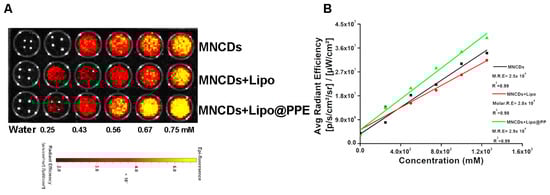(A) Increasing concentrations of MNCDs, MNCDs+Lipo, and MNCDs+Lipo@PPE were observed under the Phantom optical imaging system. (B) Concentrations vs. Avg Radiant Efficiency to calculate Molar Radiant Efficiencies (MRE).