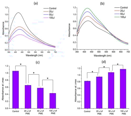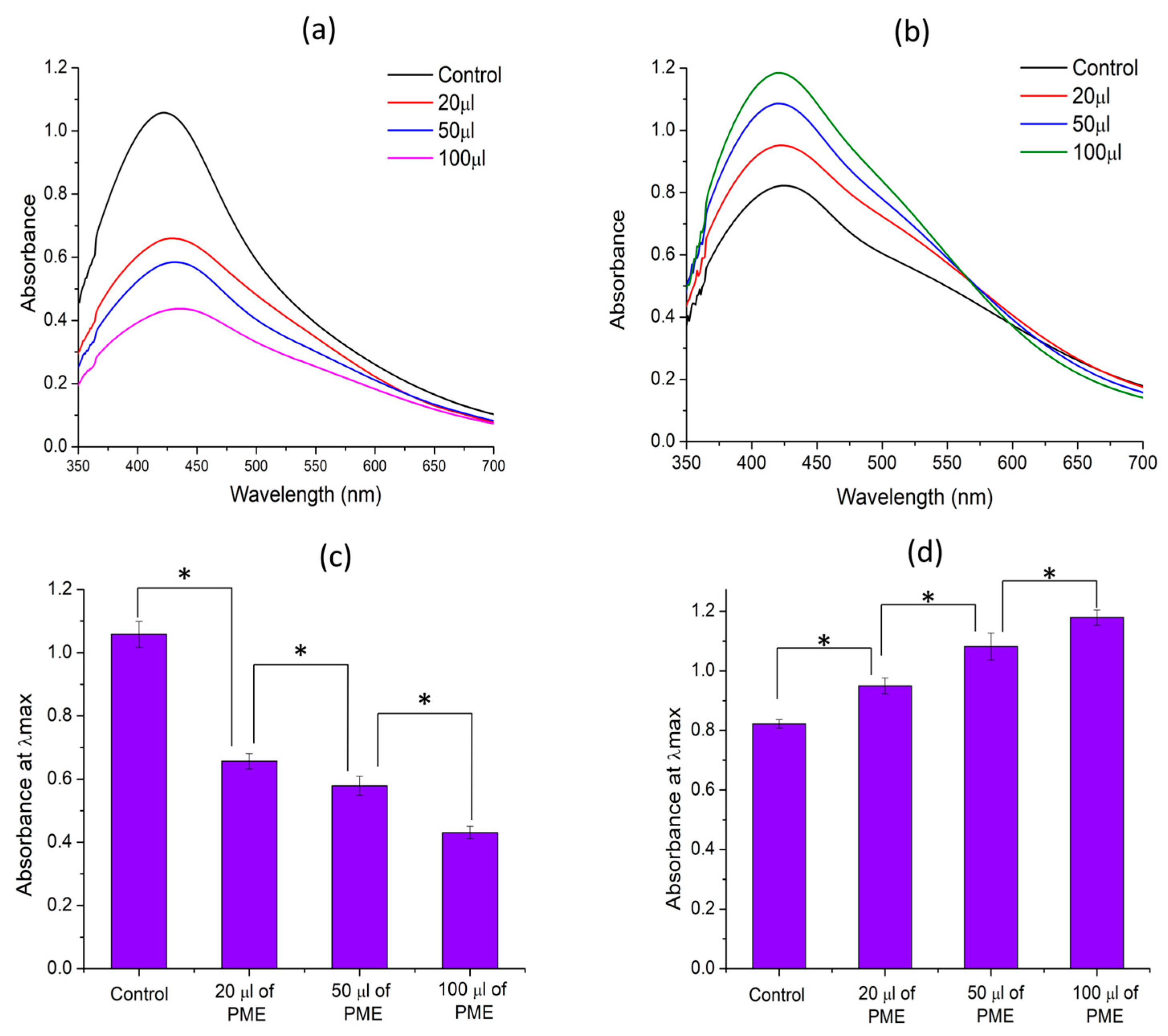 Figure 3. Dose-dependent study on the impact of PME on aqueous extract-based silver nanoparticles synthesis by under (a) dark; (b) 825 lumens of white light; (c) absorbance maxima of silver nanoparticles synthesis under dark; and (d) absorbance maxima of silver nanoparticles synthesis under 825 lumens of white light. Values presented as mean ± SD. * signifies p < 0.05.