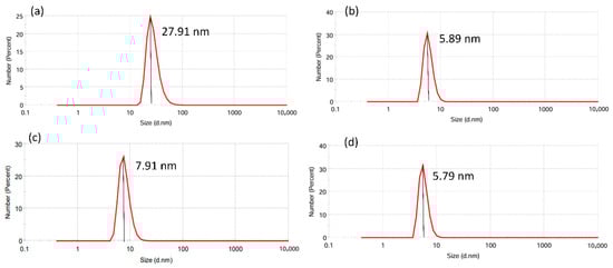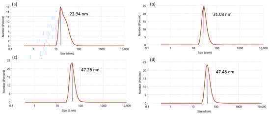Figure 4. Particle size distribution of (a) PME-AgNPs synthesized under dark condition; (b) DME-AgNPs synthesized under dark conditions; (c) PME-AgNPs synthesized under 825 lumens of white light; and (d) DME-AgNPs synthesized under 825 lumens of white light.