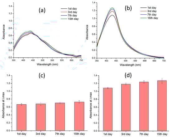 A 15-day study was conducted to evaluate the stability of PME- and DME-based AgNPs by monitoring absorption spectra over time. Consistent spectral profiles, without significant deviations, were observed (Figure 8). The absorbance intensity of PME-AgNPs was observed to be consistently stable, whereas the absorbance intensity of DME-AgNPs was observed not only to be stable but also steadily increasing in quantity, albeit at a much significantly slower rate as compared to the rate of synthesis at room temperature.