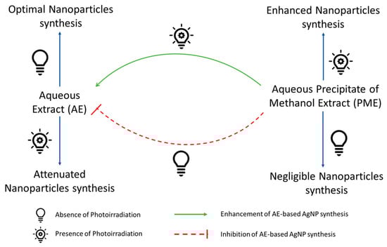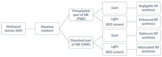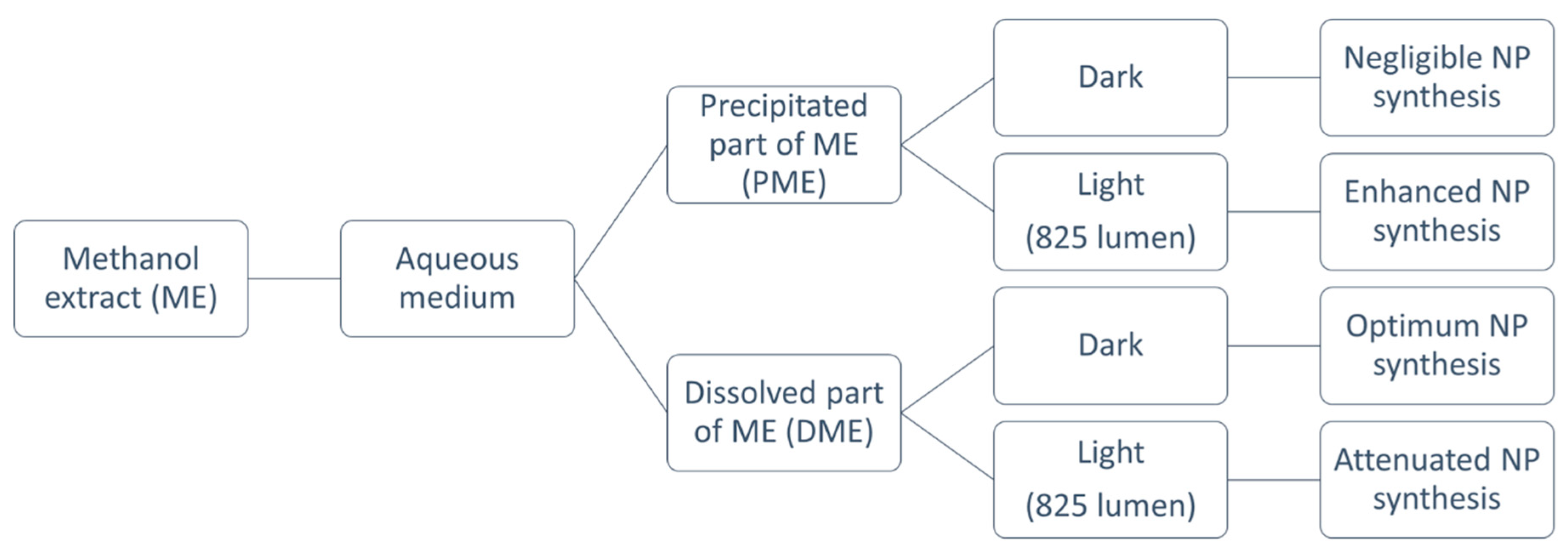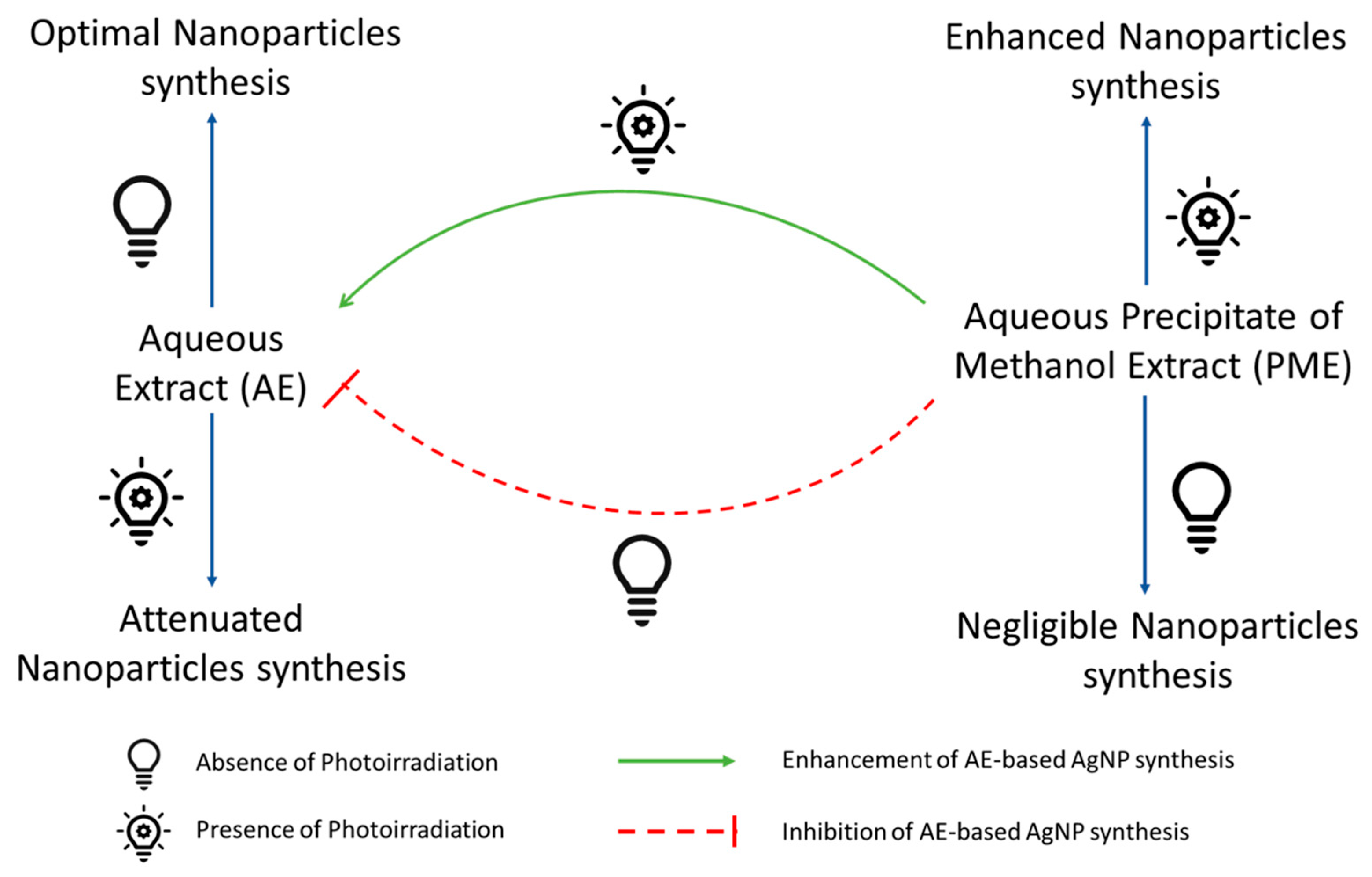 In the current study, we intended to understand the mechanism of AgNP synthesis of methanol extract with light as the controlling factor. We hypothesized that the components of the ME contributed to the dual behavior of enhancement and inhibition of nanoparticles synthesis. Initially, the ME underwent aqueous phase separation, thereby producing PME and DME. These two sub-extracts were then explored for AgNP synthesis in various light conditions, the outcome of which gave distinct results (Figure 9).