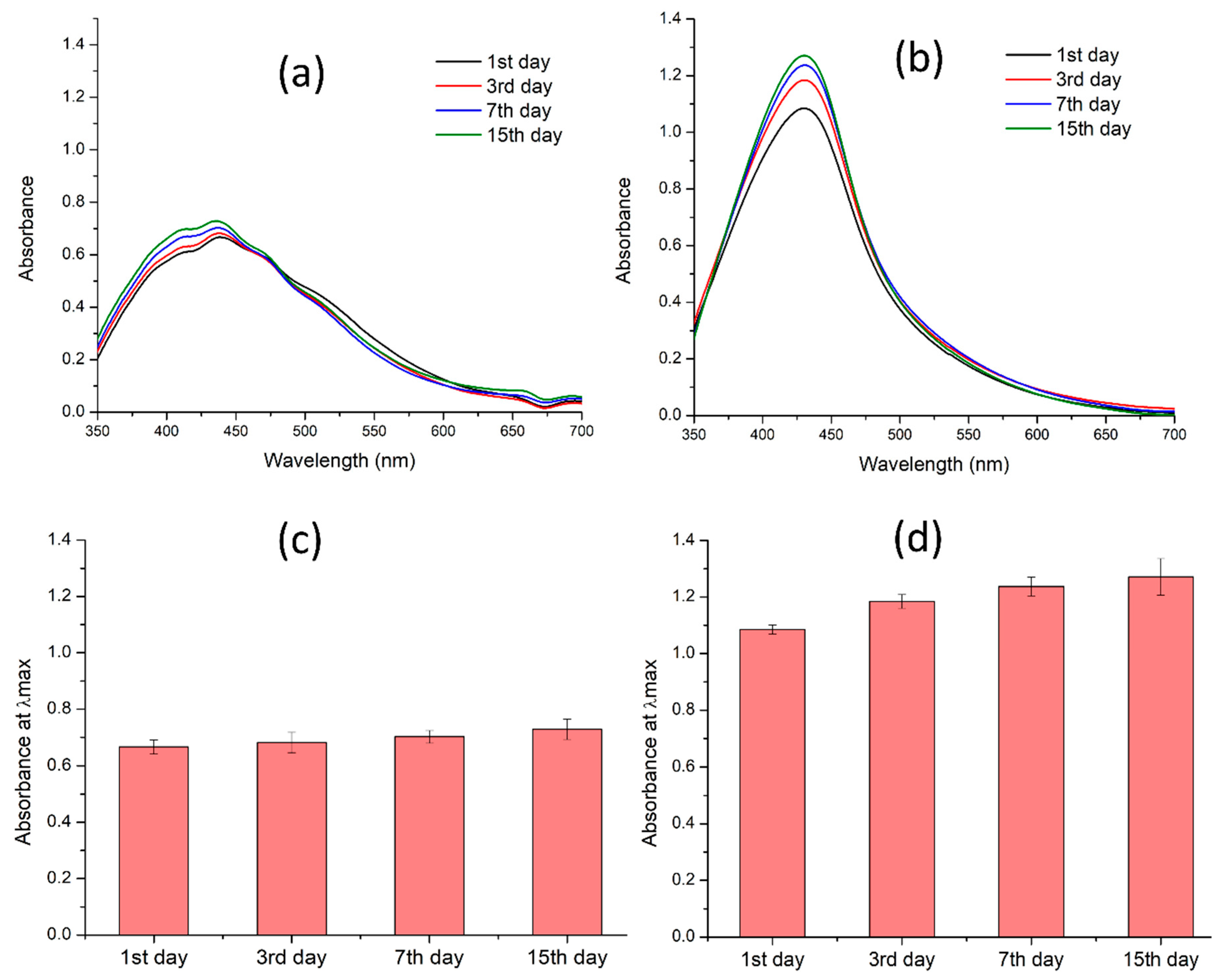 Figure 8. Nanoparticles stability study of AgNPs synthesized by (a) PME and (b) DME and absorbance taken at λmax of (c) PME and (d) DME. (c) Absorbance maxima of silver nanoparticles synthesis under dark and (d) absorbance maxima of silver nanoparticles synthesis under 825 lumens of white light. Values presented as mean ± SD. * signifies p < 0.05.